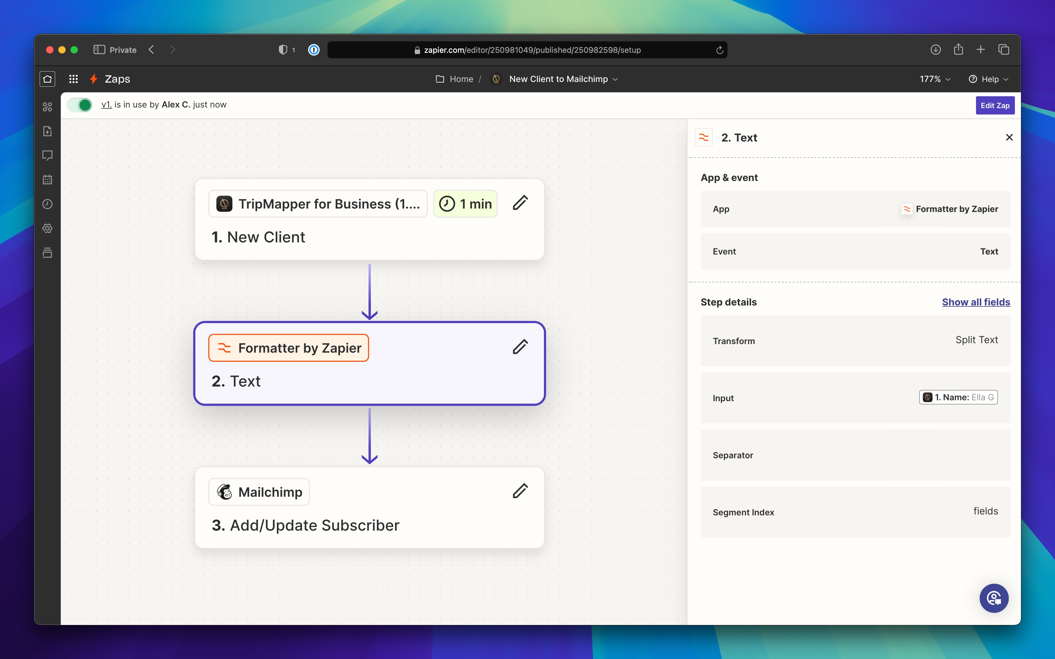 In this Zap, we take the New Client TripMapper event and pass the resulting data through a Text Formatter step before pushing it to Mailchimp via the Add/Update Subscriber action.
