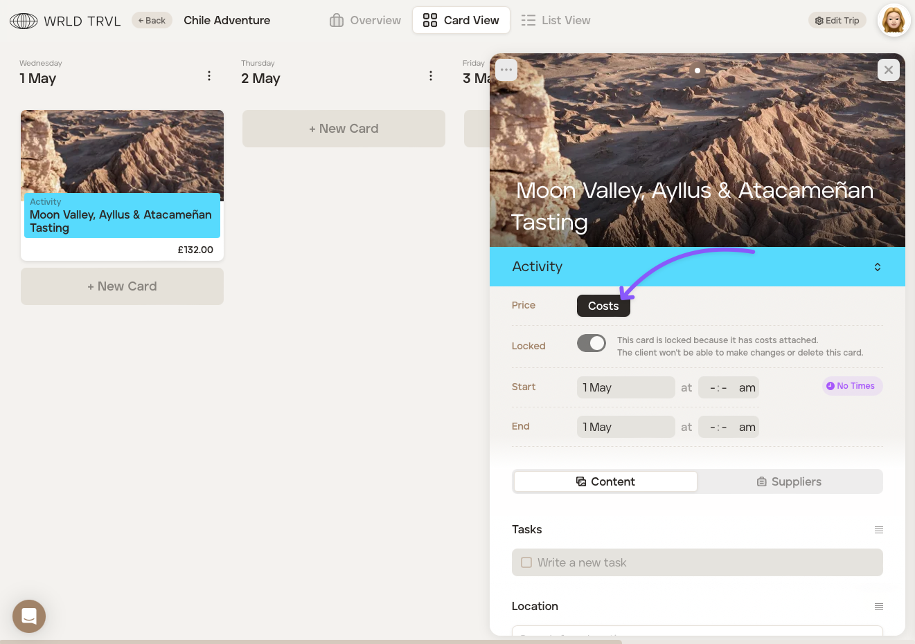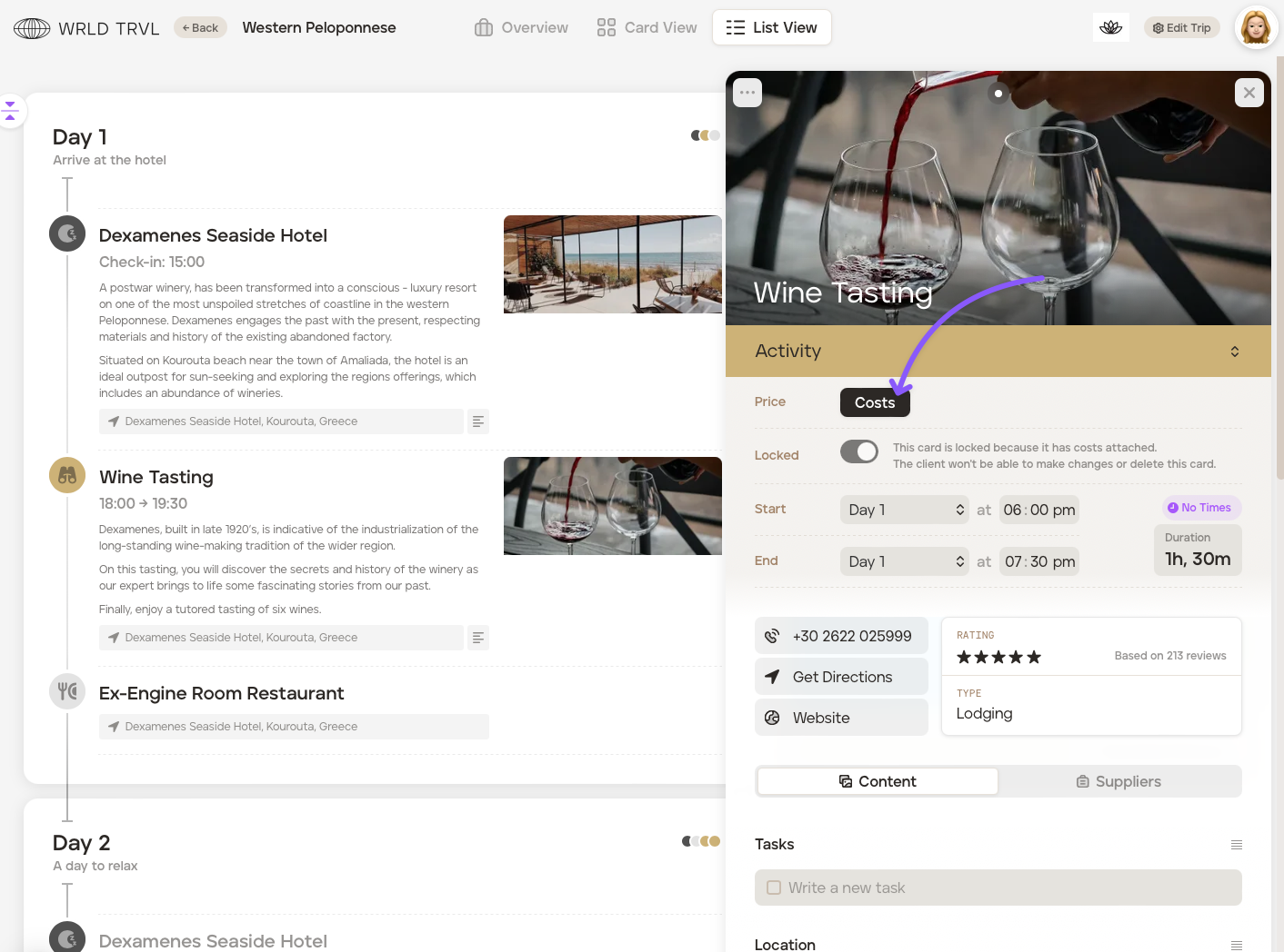 1. Add individual costs to your cards directly within the itinerary