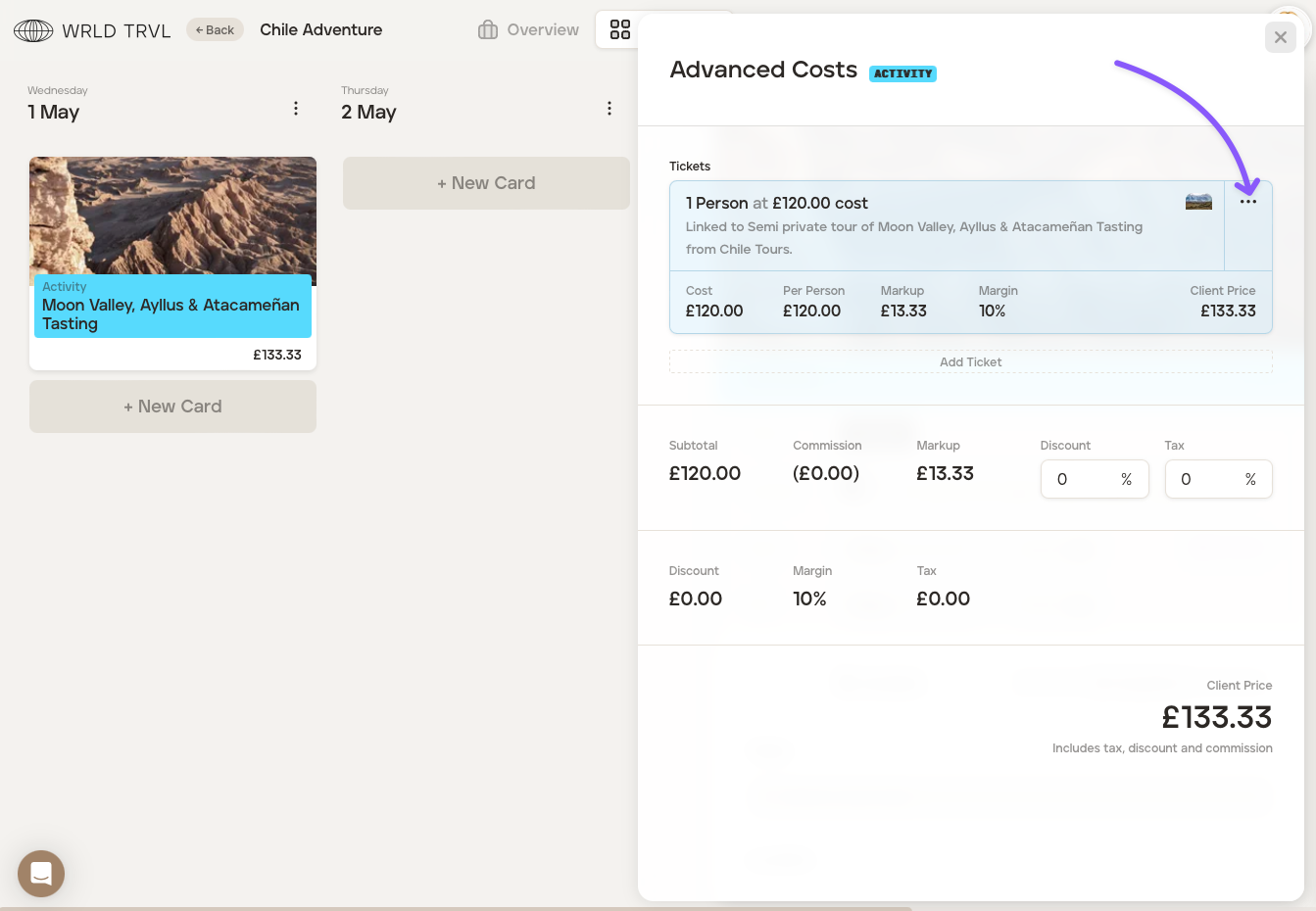 The costs associated with the supplier product chosen will be shown. Click the '...' button to edit the information, such as changing the number of tickets.