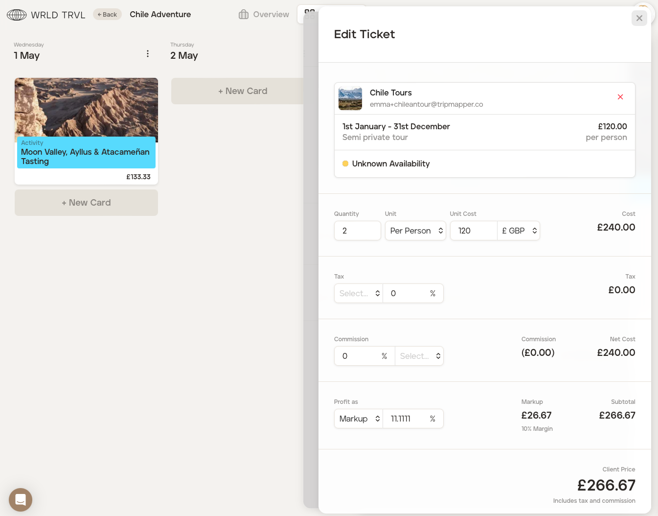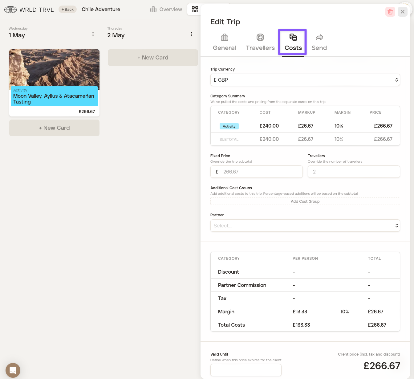 If after adding all your costs, you want to add any additional charges, for example, champagne for a special occasion, or visa service fees, check out the 'Create an additional cost group on a specific itinerary' article.