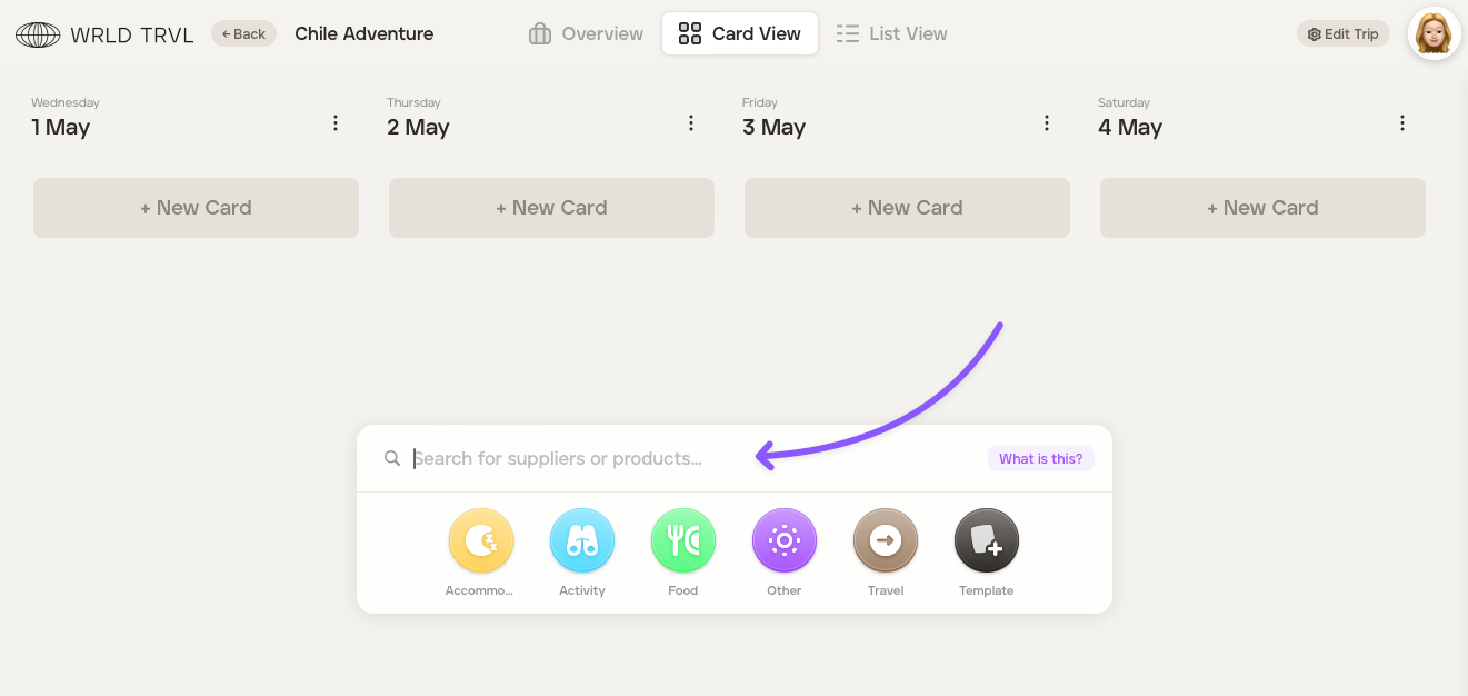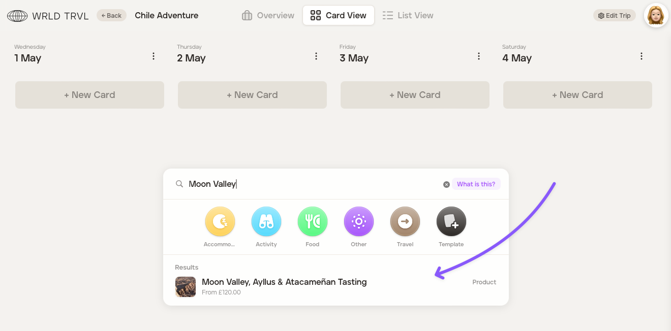 Create a new card or click the relevant card already within the itinerary.