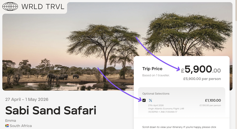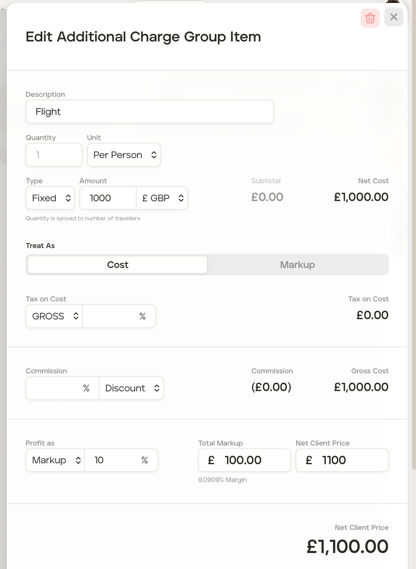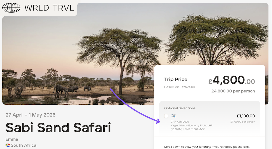 For example, your proposal price may be £8,000.00, but you'd like to offer an optional flight upgrade on top of that. Rather than building it into the base client price, you can present it as a separate, selectable add-on — allowing the client to choose whether they'd like to include it when they approve their proposal.