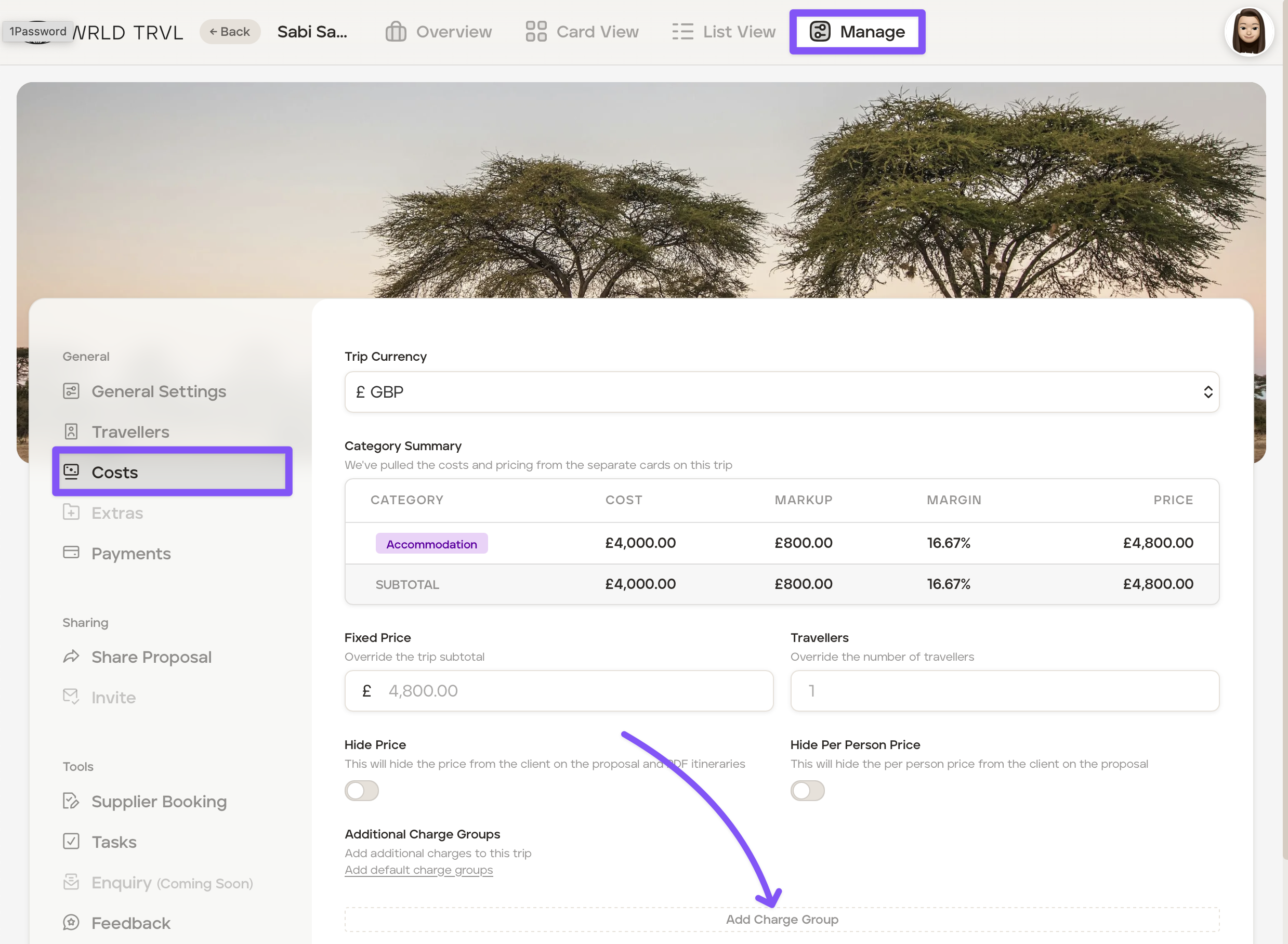 Navigate to the 'Costs' tab and click 'Add Charge Group'.