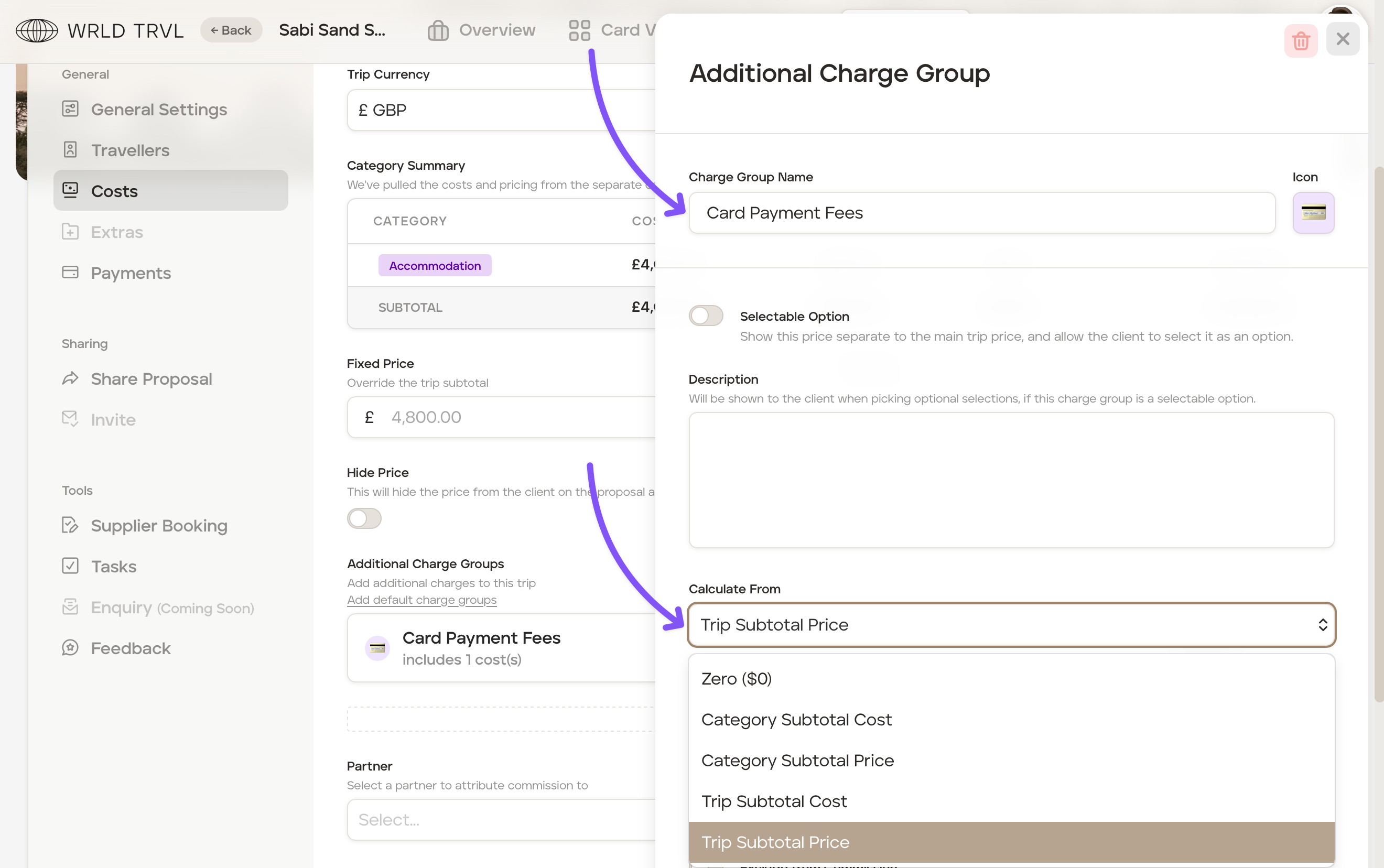 Trip Subtotal Price - This will calculate the additional charge from the entire trip subtotal client price (ie. all itinerary card client prices plus any other additional charges).