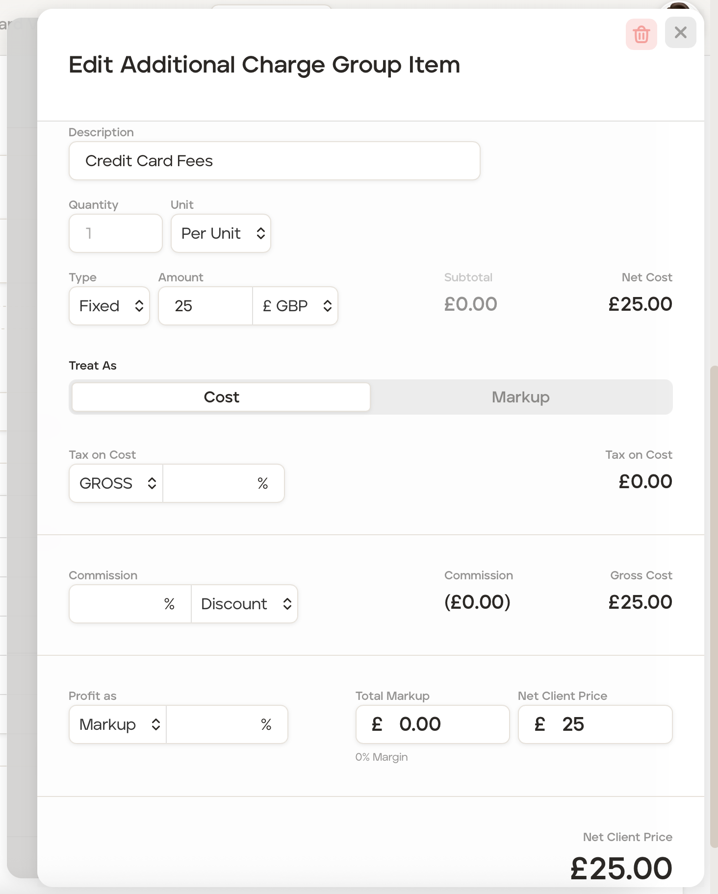 The 'Costs' screen will now add the £25 charge to the total client price, taking the client price from £4,800 to £4,825.