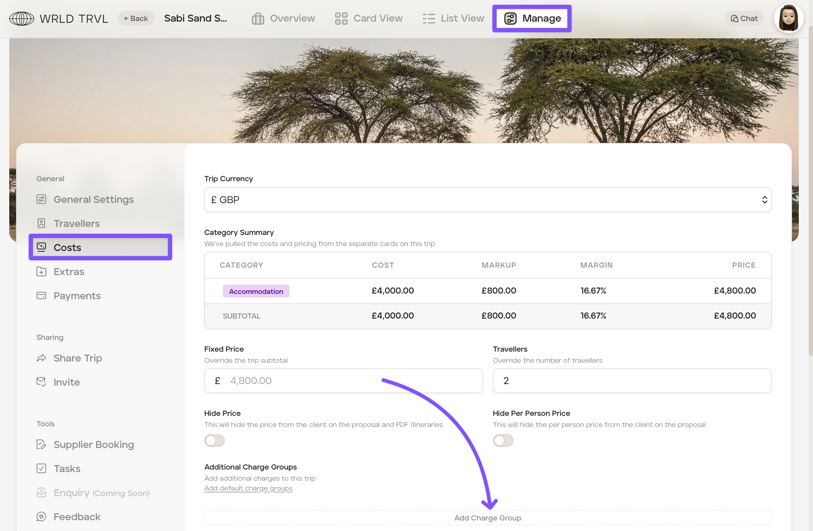 In the 'Costs' section of the trip, click 'Add Charge Group.'