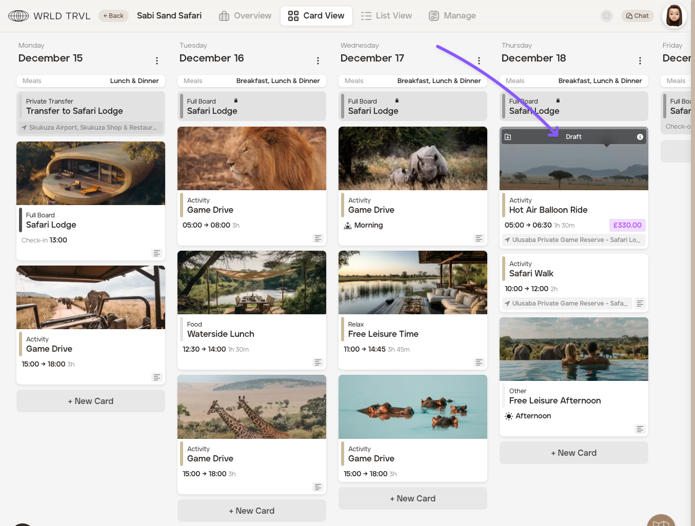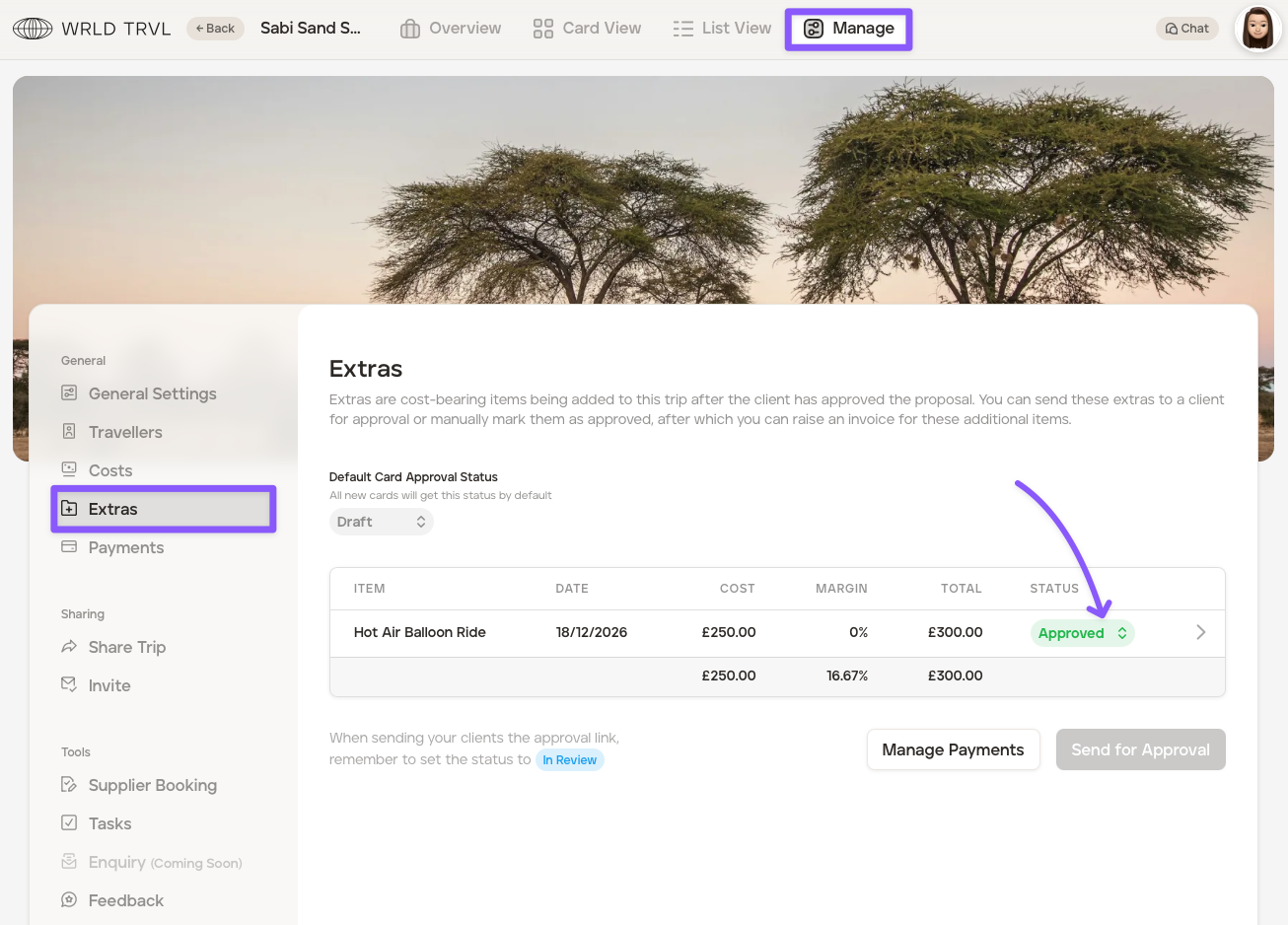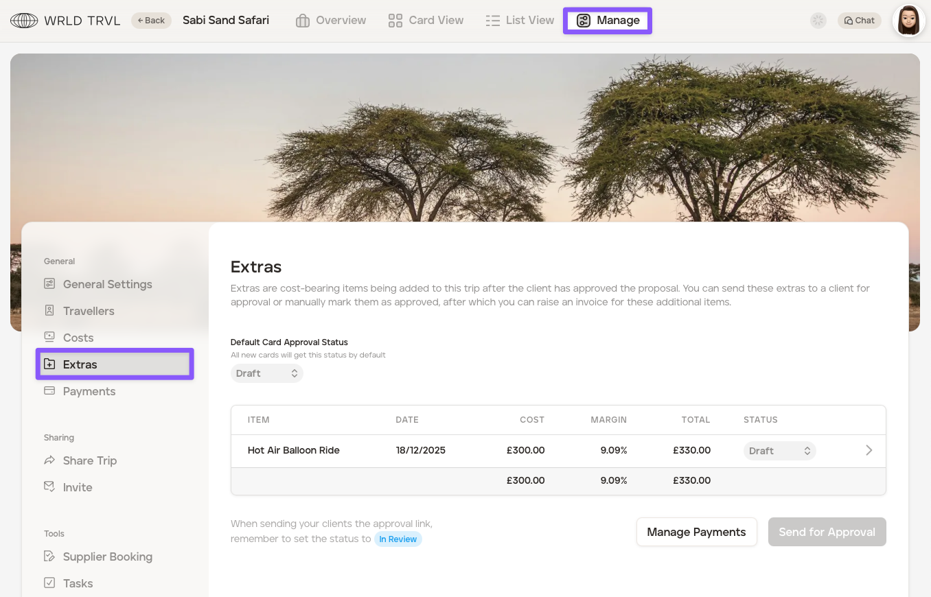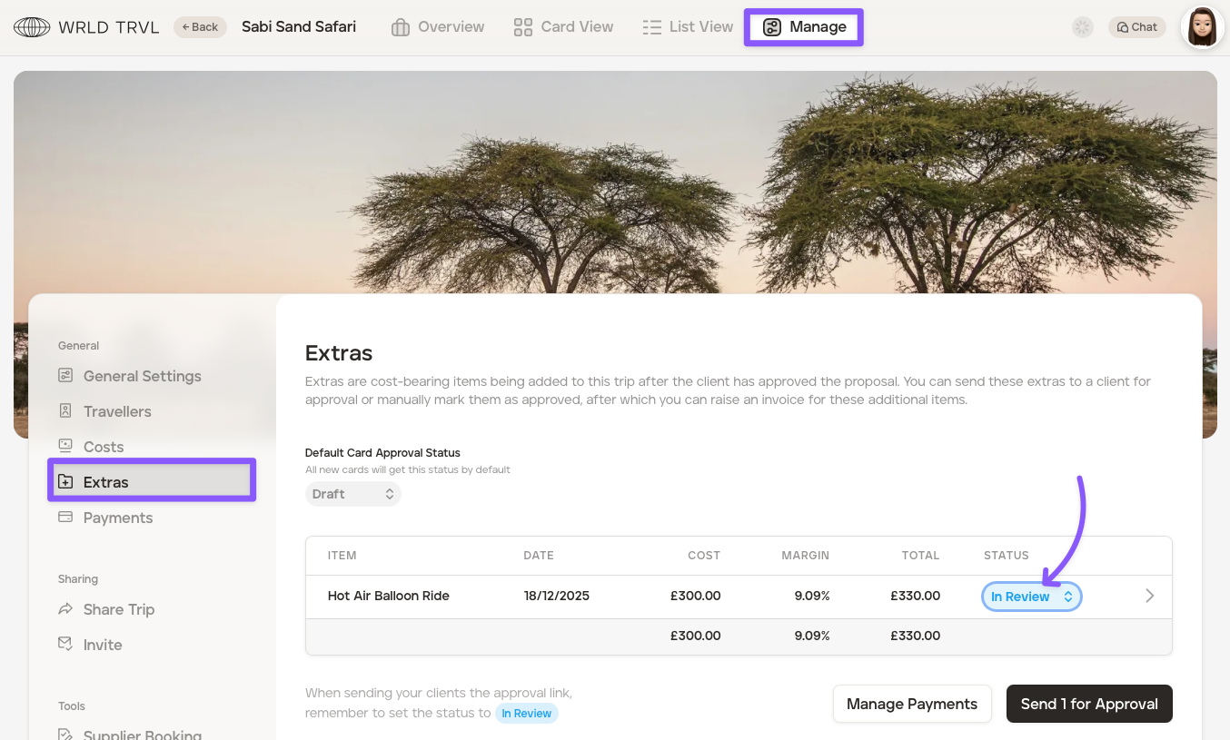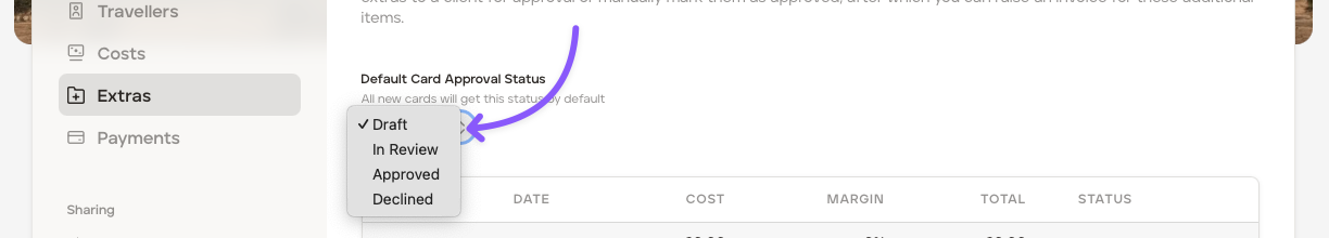 The default card status for 'Extras' is 'Draft', however, you have the option to set the default status to automaticaly be 'In Review' or 'Approved.' After a new default status has been chosen and set, all new 'Extras' cards added to that upcoming itinerary will get that new chosen default status automatically:
