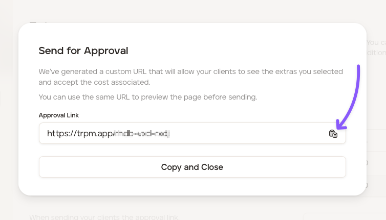 Click the 'Send for Approval' button to generate a custom URL that will allow your clients to view the extra(s) you selected and approve (you can use the same URL to preview the page before sending). Click the copy icon to copy the link and then share with your client: