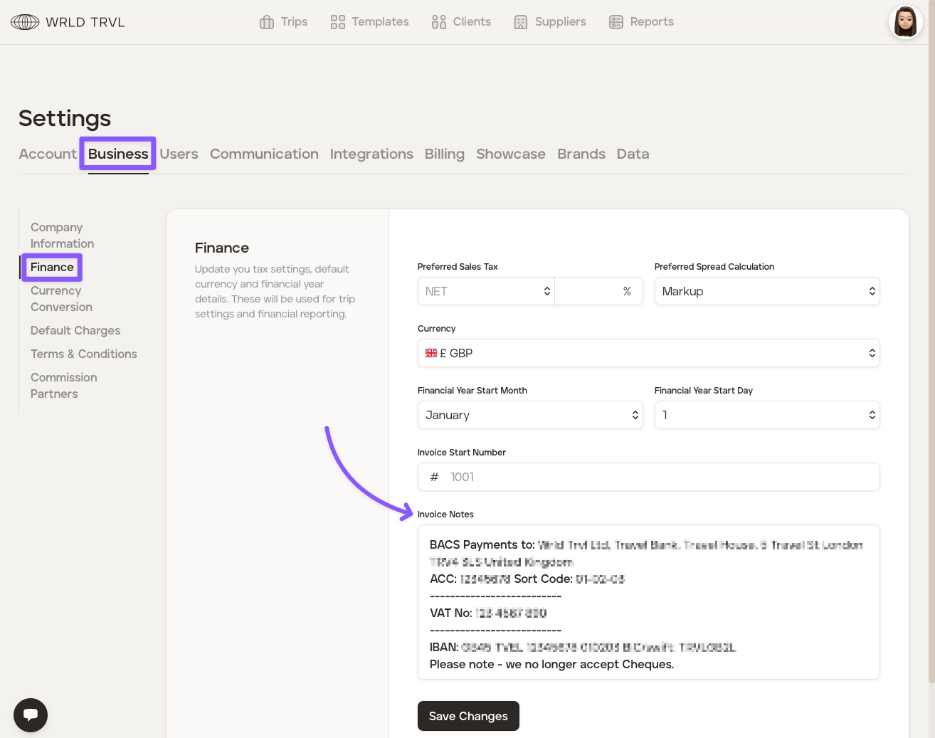 Add or edit the relevant information in the 'Invoice Notes' section.