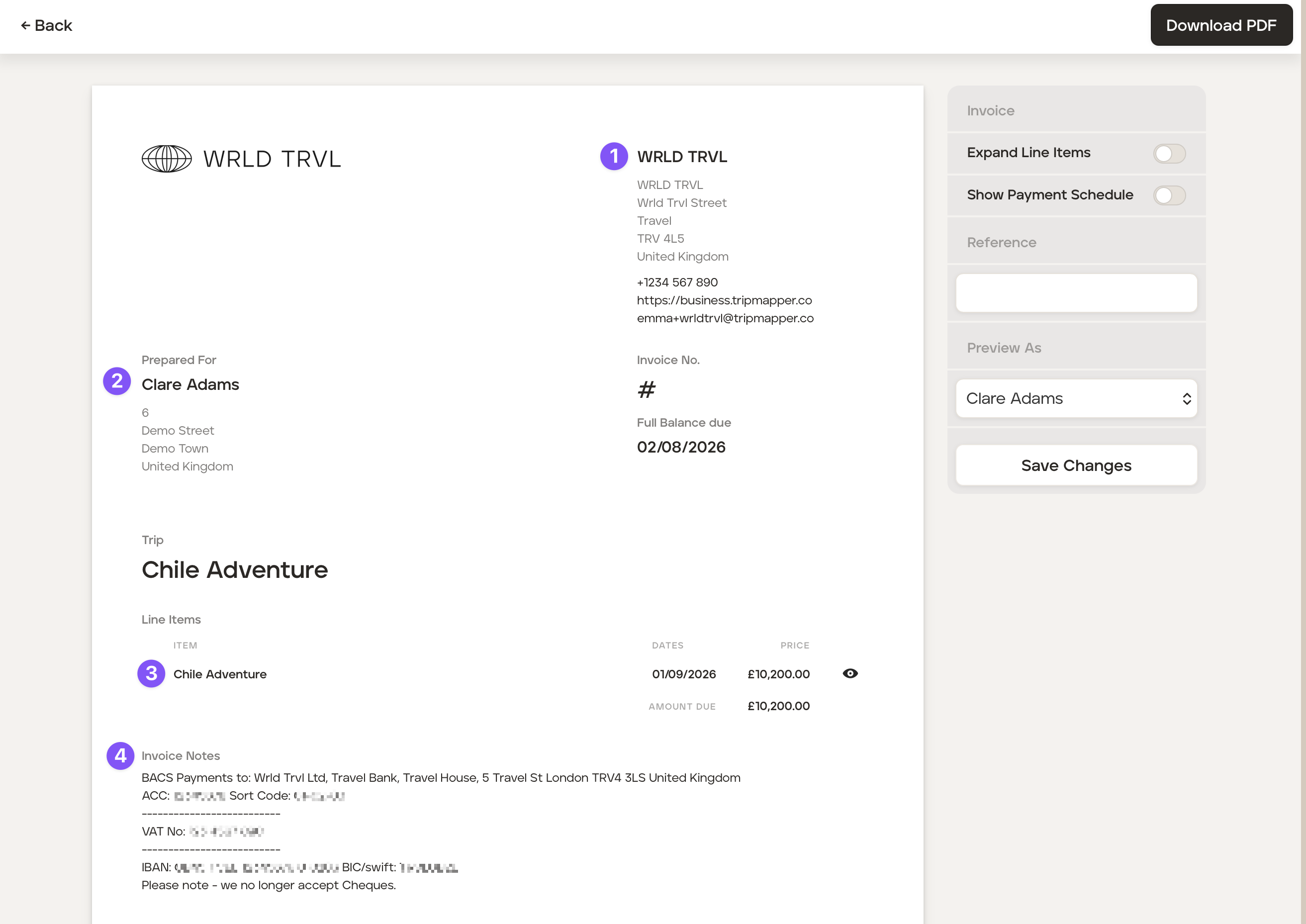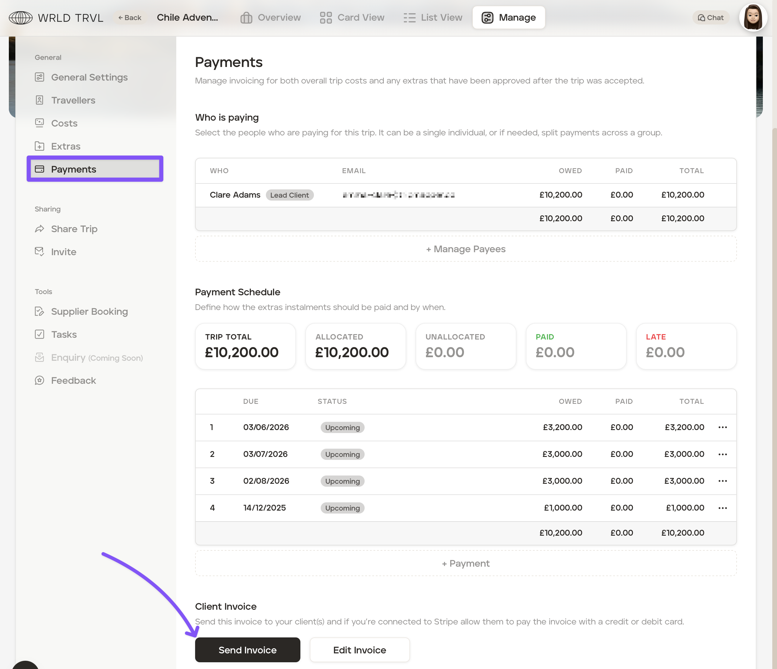 In the ‘Client Invoice’ of the 'Payments' section of a trip, you can edit and send invoices to your clients. The invoices will be branded with the business details set in the account 'Settings'.