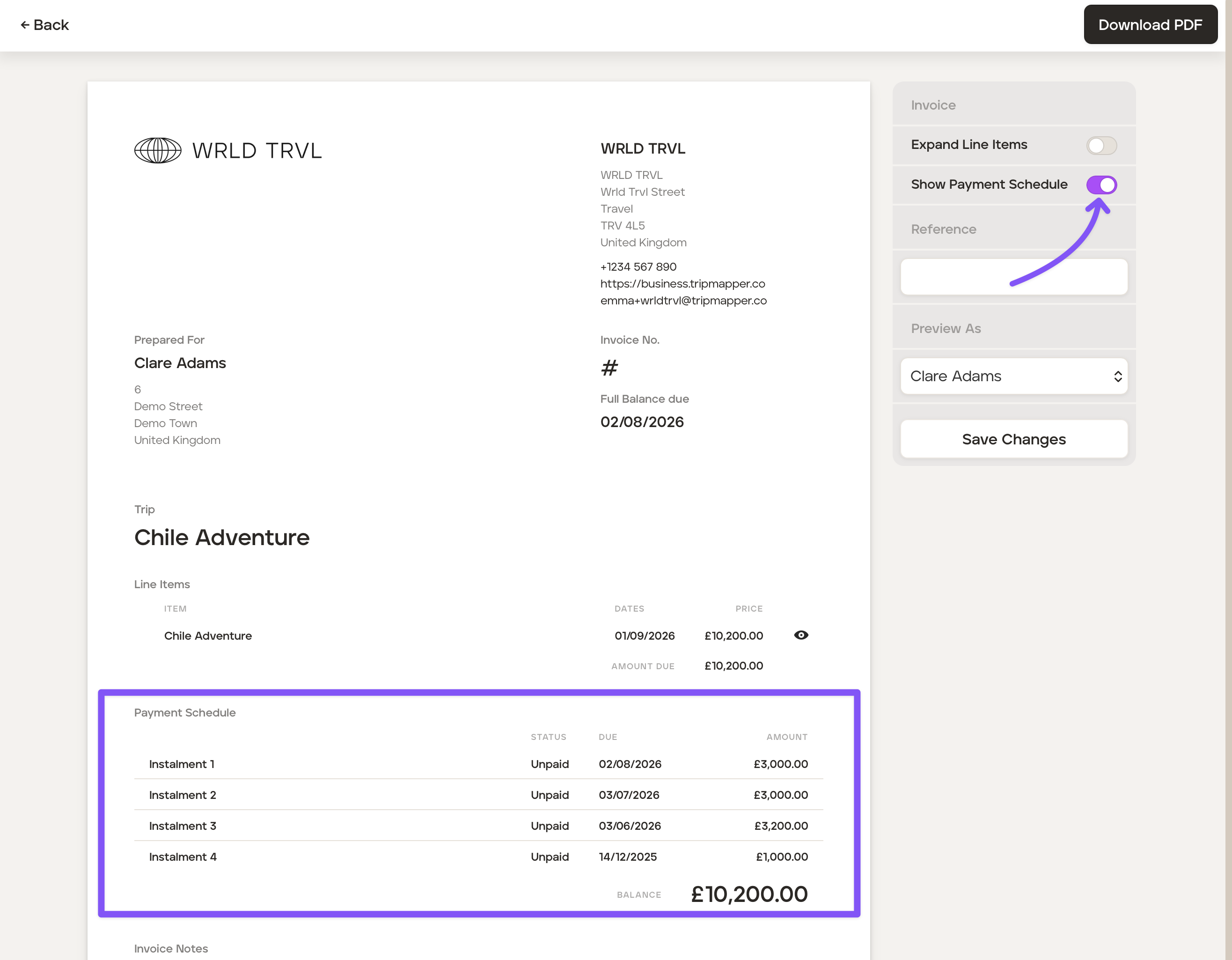 To include the payment schedule, toggle the 'Show Payment Schedule' on and click the 'Save Changes' button.