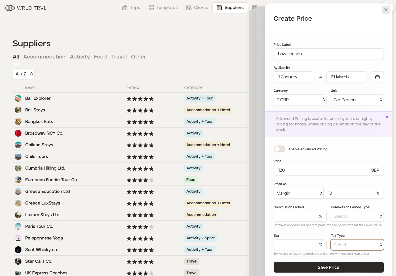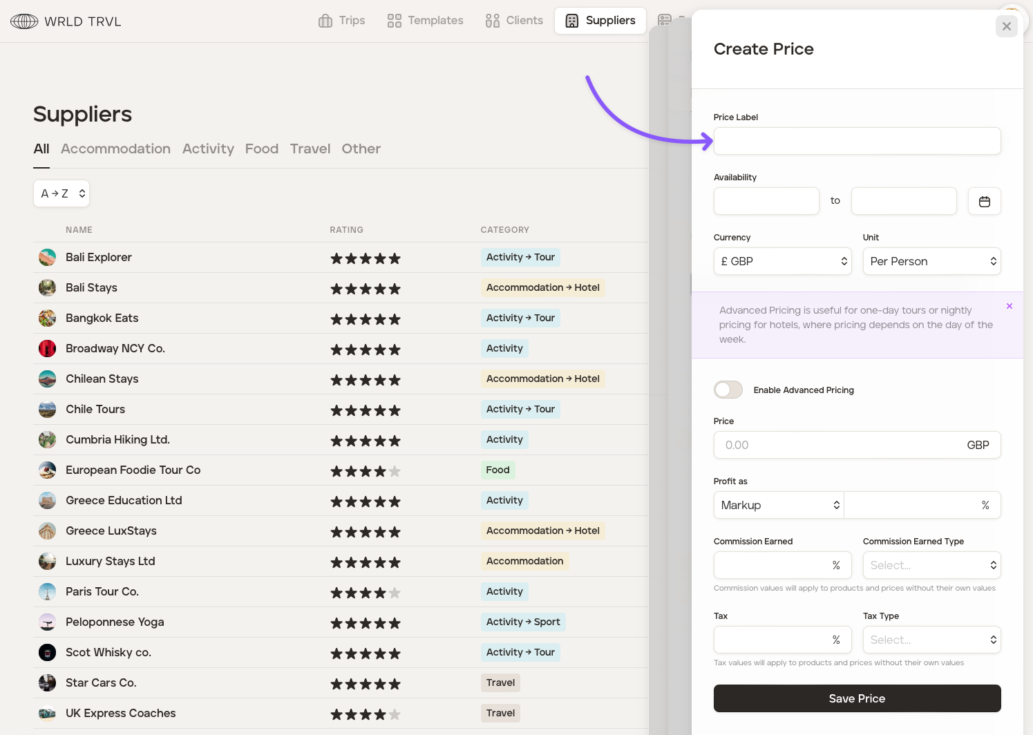 Add the price. 'Advanced pricing' is useful for one-day tours or nightly pricing for hotels, where pricing depends on the day of the week. To add advanced pricing, toggle the 'Enable Advanced Pricing' switch to turn on. Turning the switch on will reveal the days of the week where you can input prices for every day of the week.