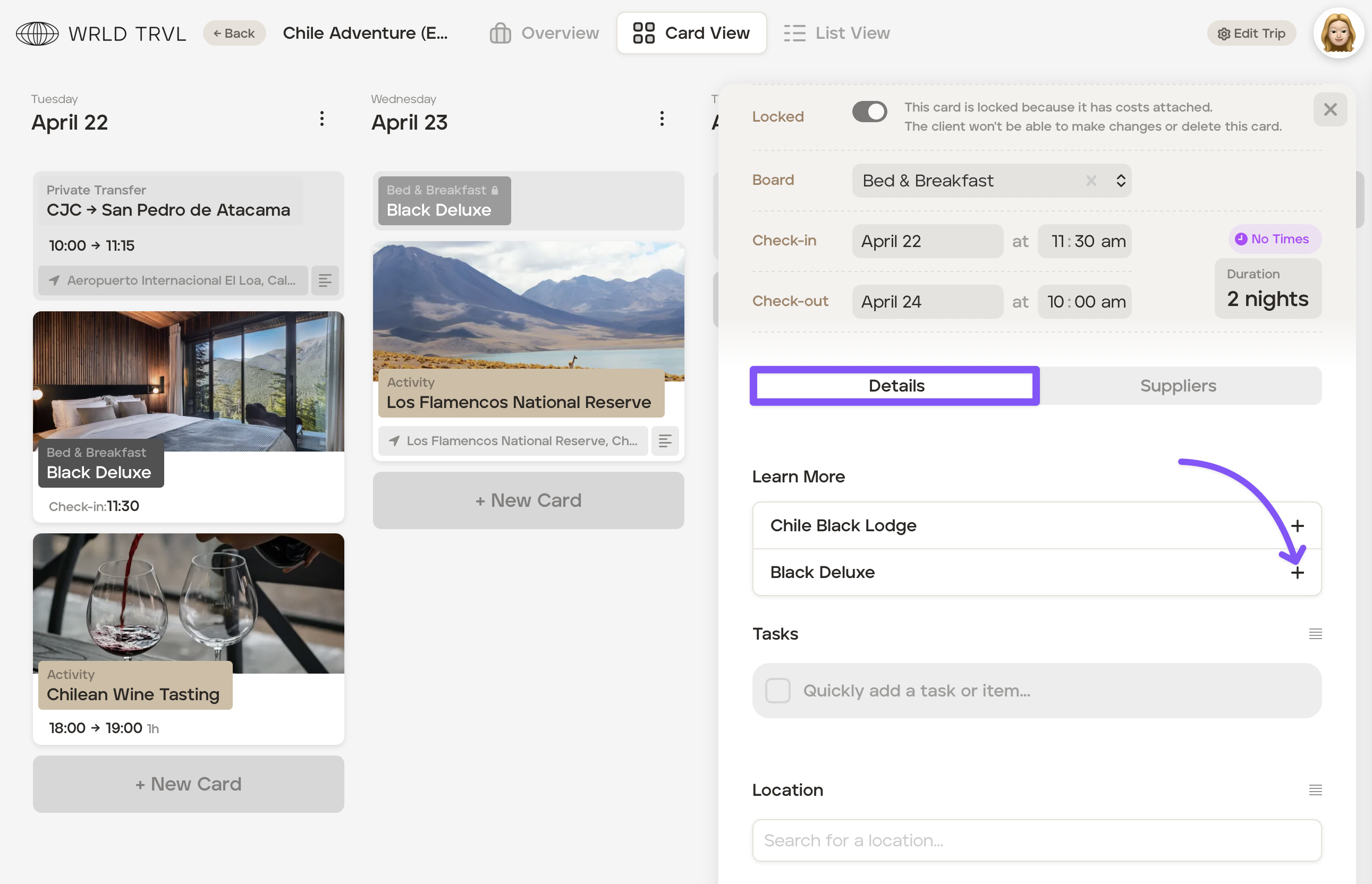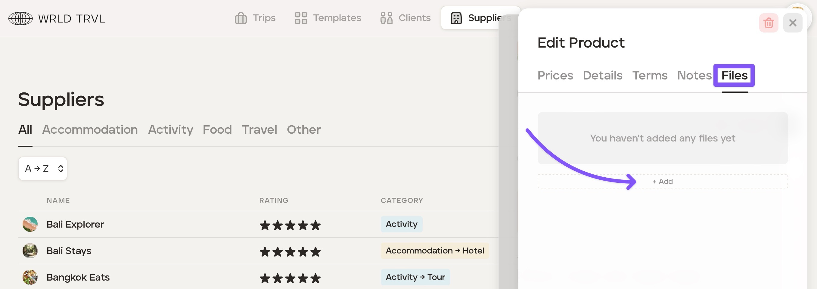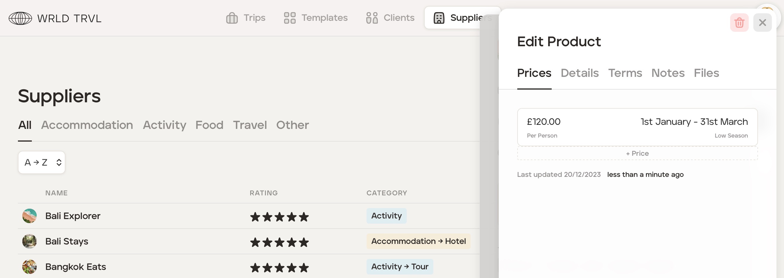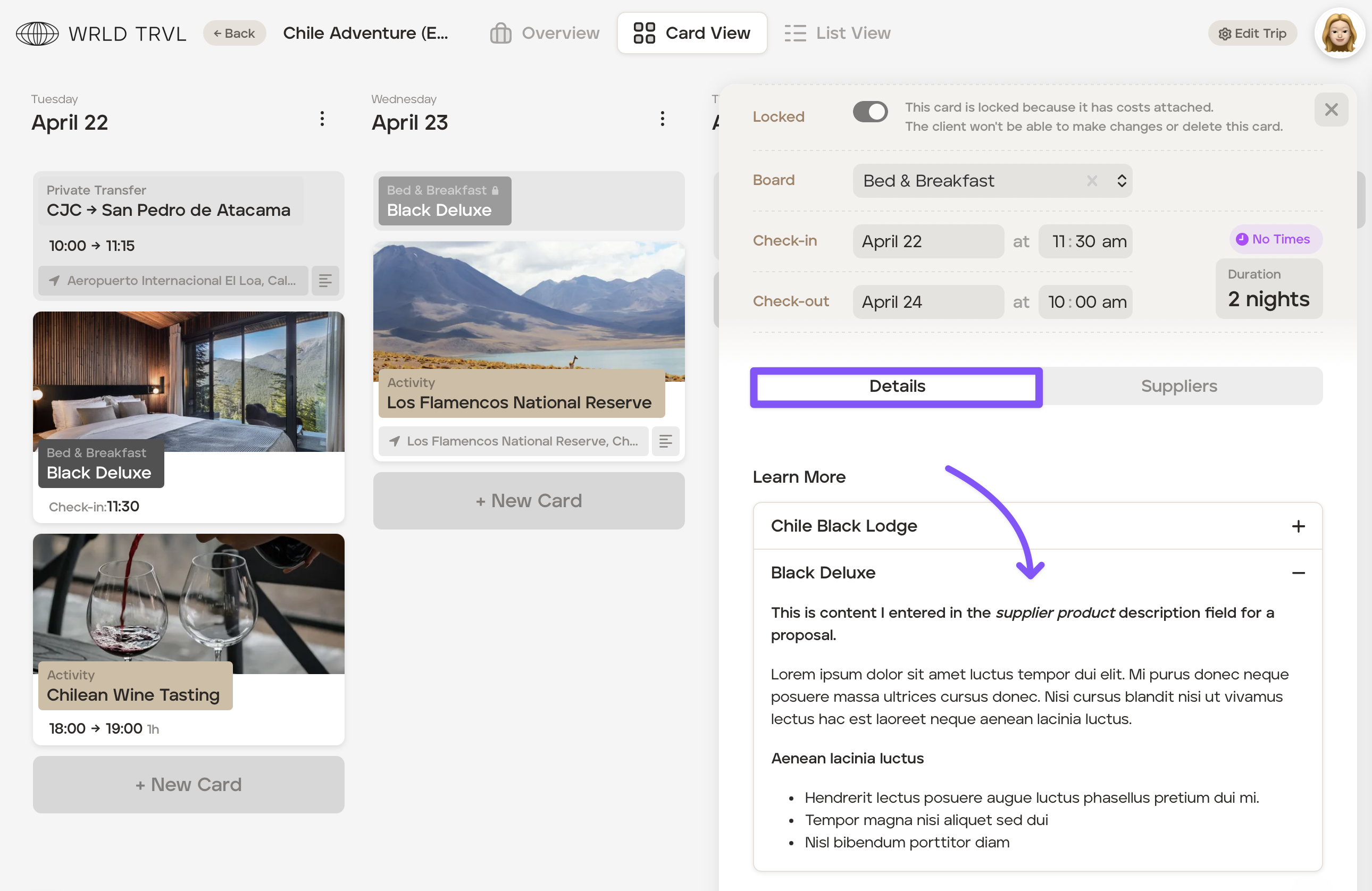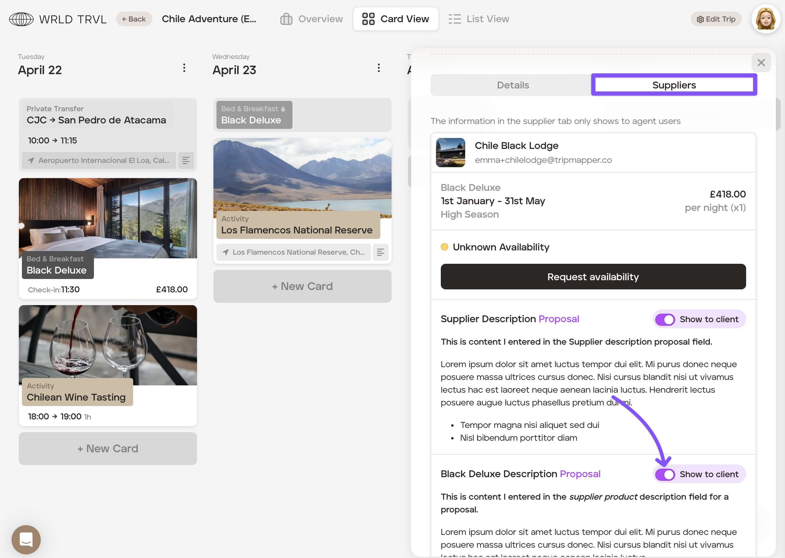 You still have the ability to choose whether or not you want the supplier product description you've added to be shown to your client. By default the description entered will be shown to your client, unless you switch it off on the specific proposal itinerary and/or upcoming trip itinerary: