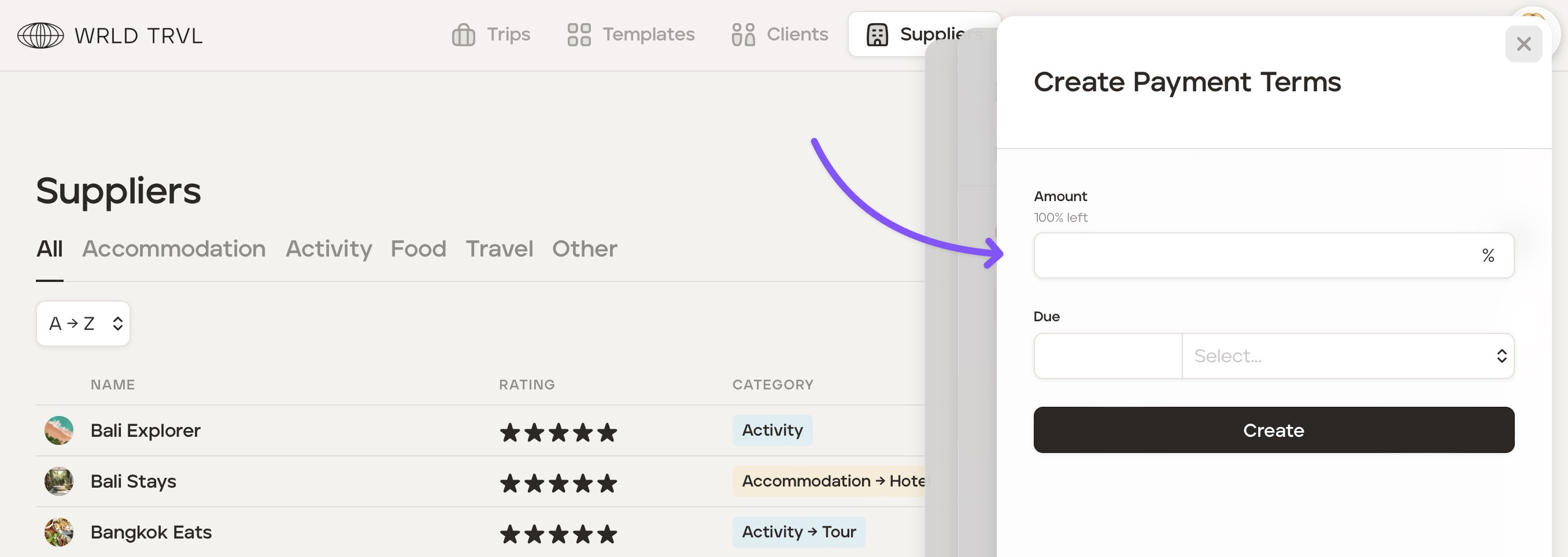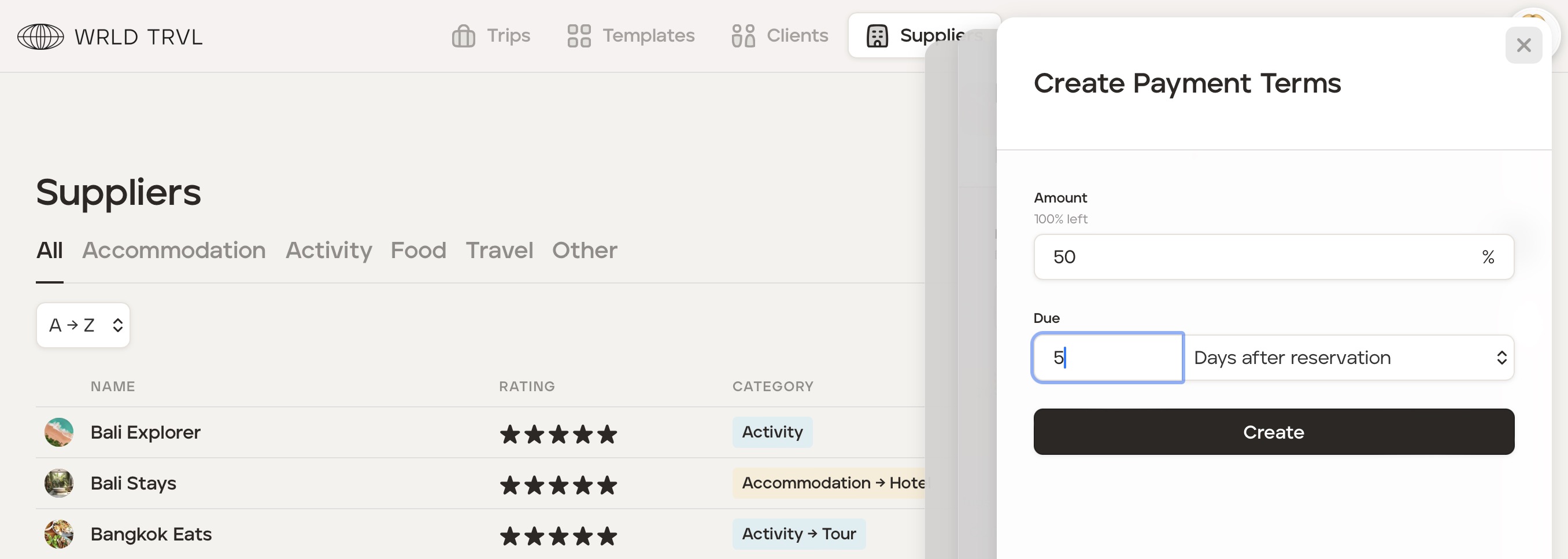 A 'Create Payment Terms' modal will appear on the right-hand side of the screen.