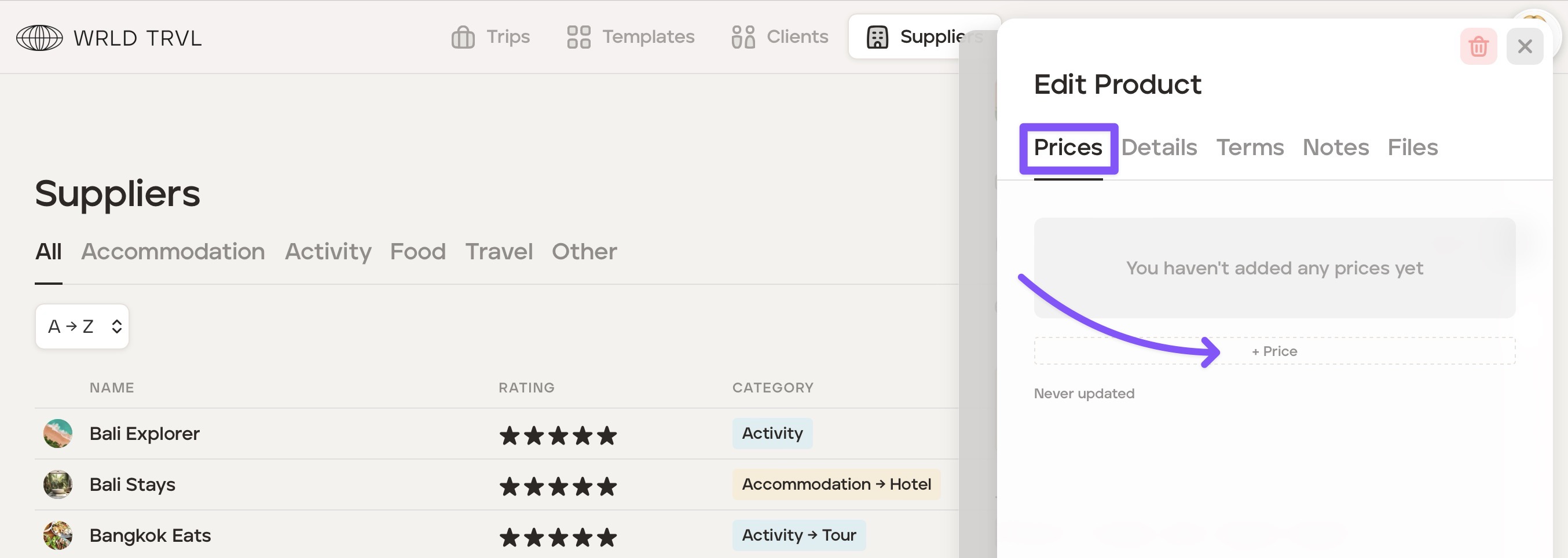 A 'Create Price' modal will appear on the right-hand side of the screen.
