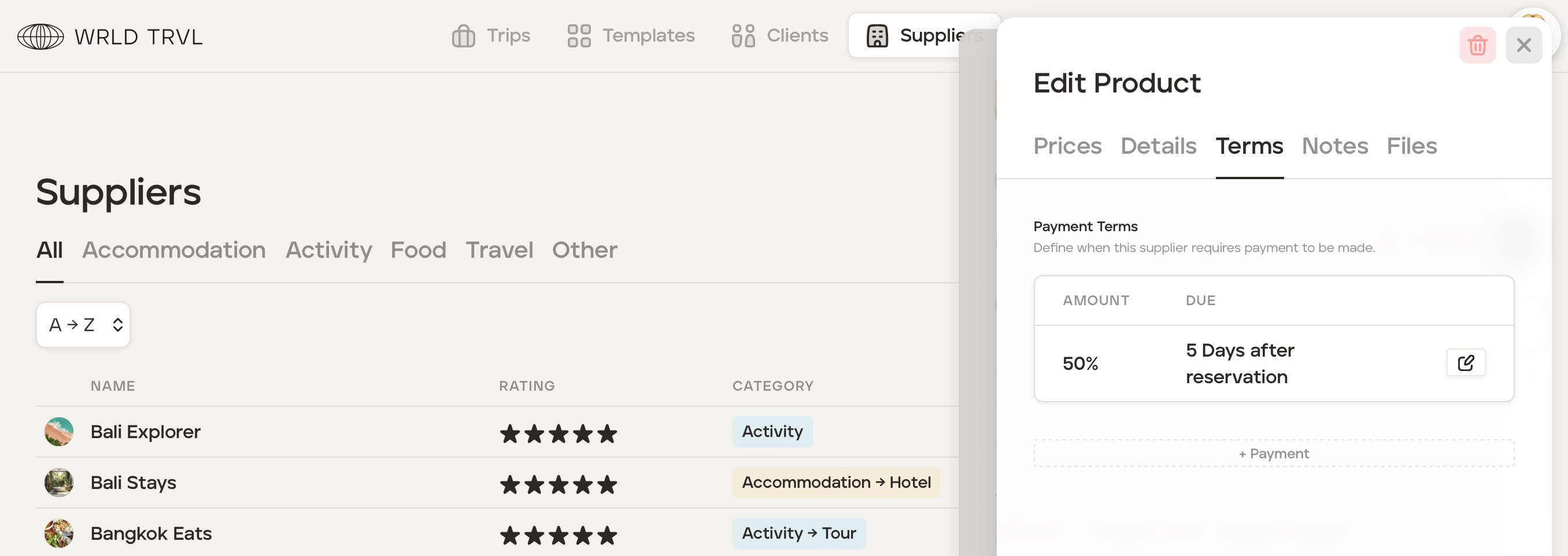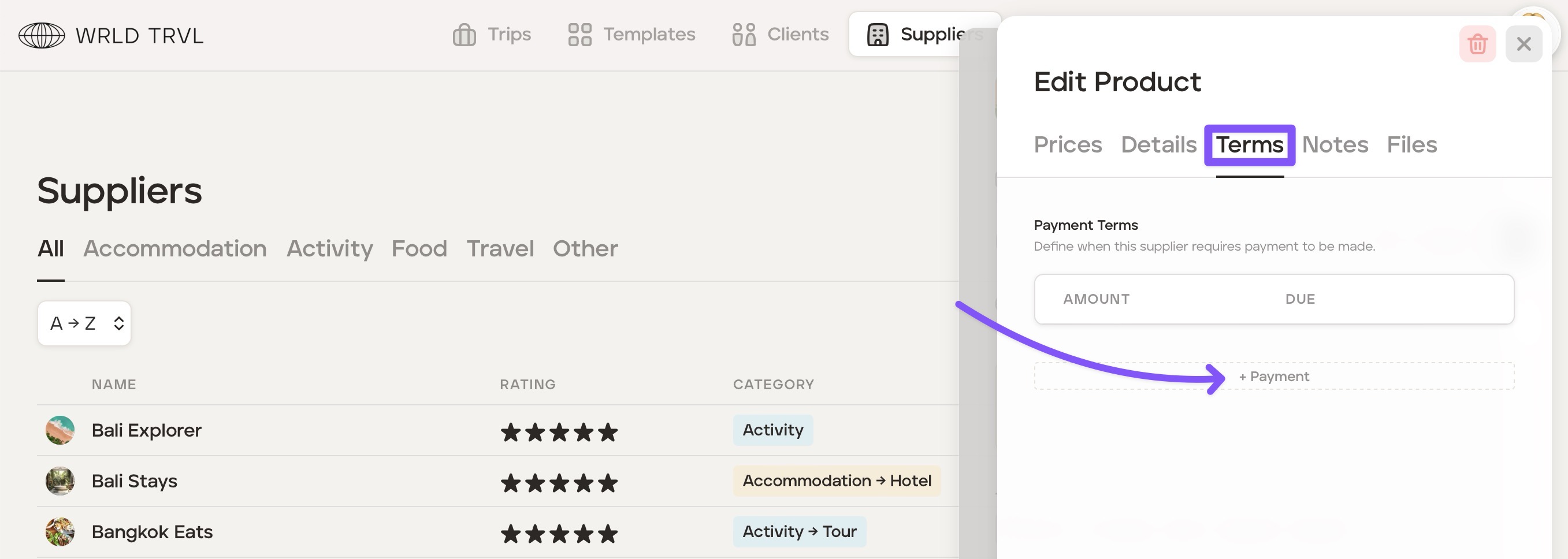 You will now return to the ‘Terms’ tab which now shows the payment instalment you created. Click ‘+ Payment’ to add further payment instalment.