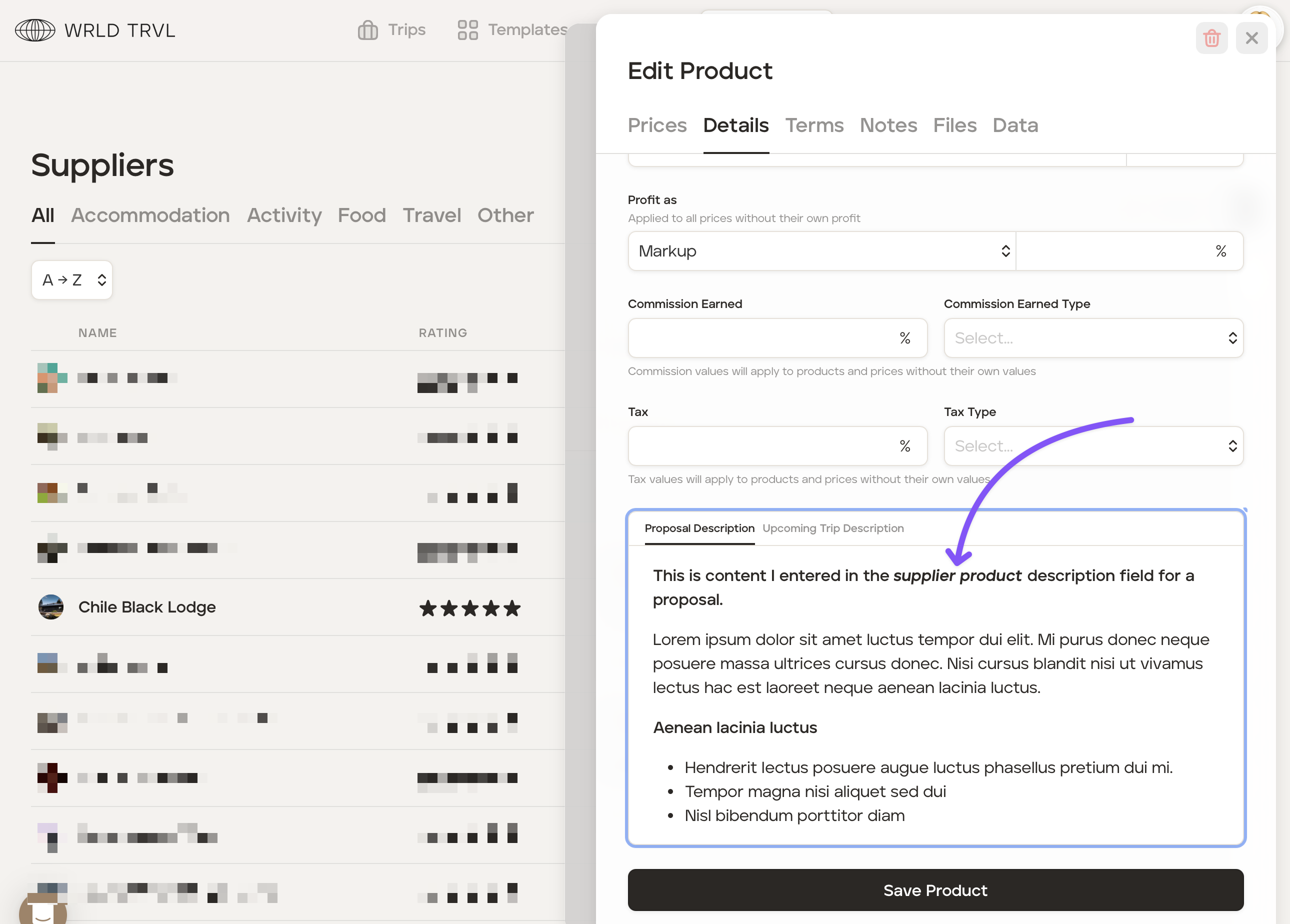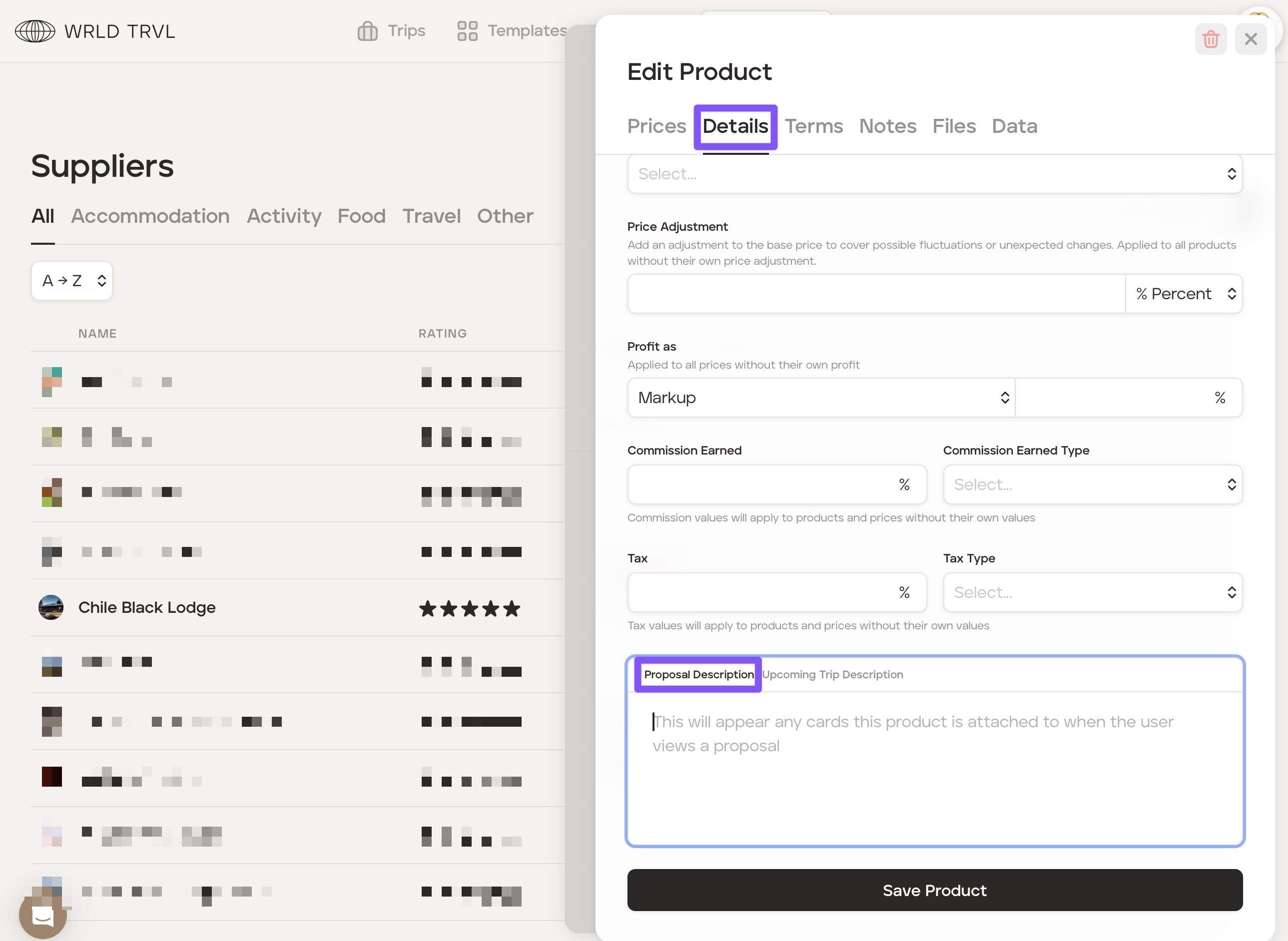 You may want your client to be able to view a description of a supplier product, for example, where the supplier is a hotel, and the supplier product is the hotel room. In order to add a supplier product description scroll down to the 'Proposal Description' and 'Upcoming Trip Description' tabs.