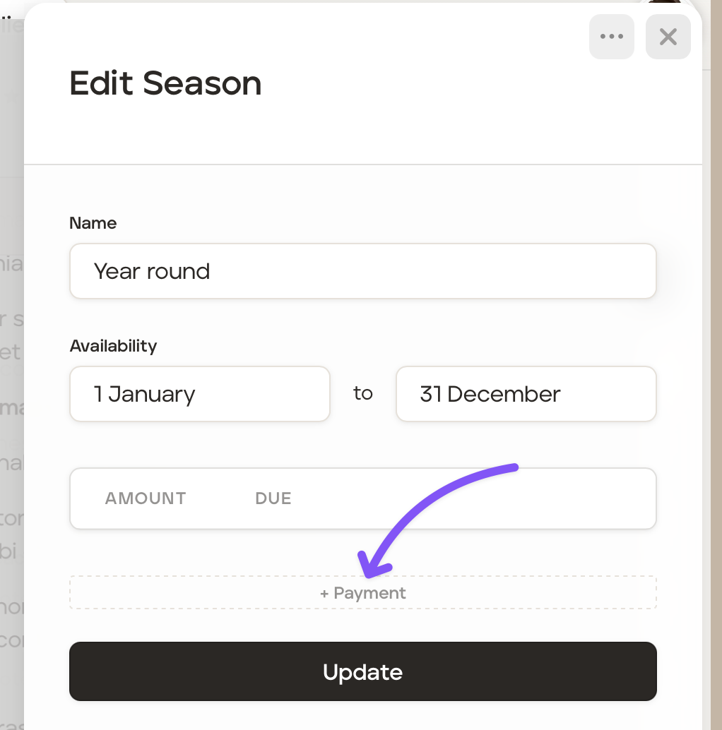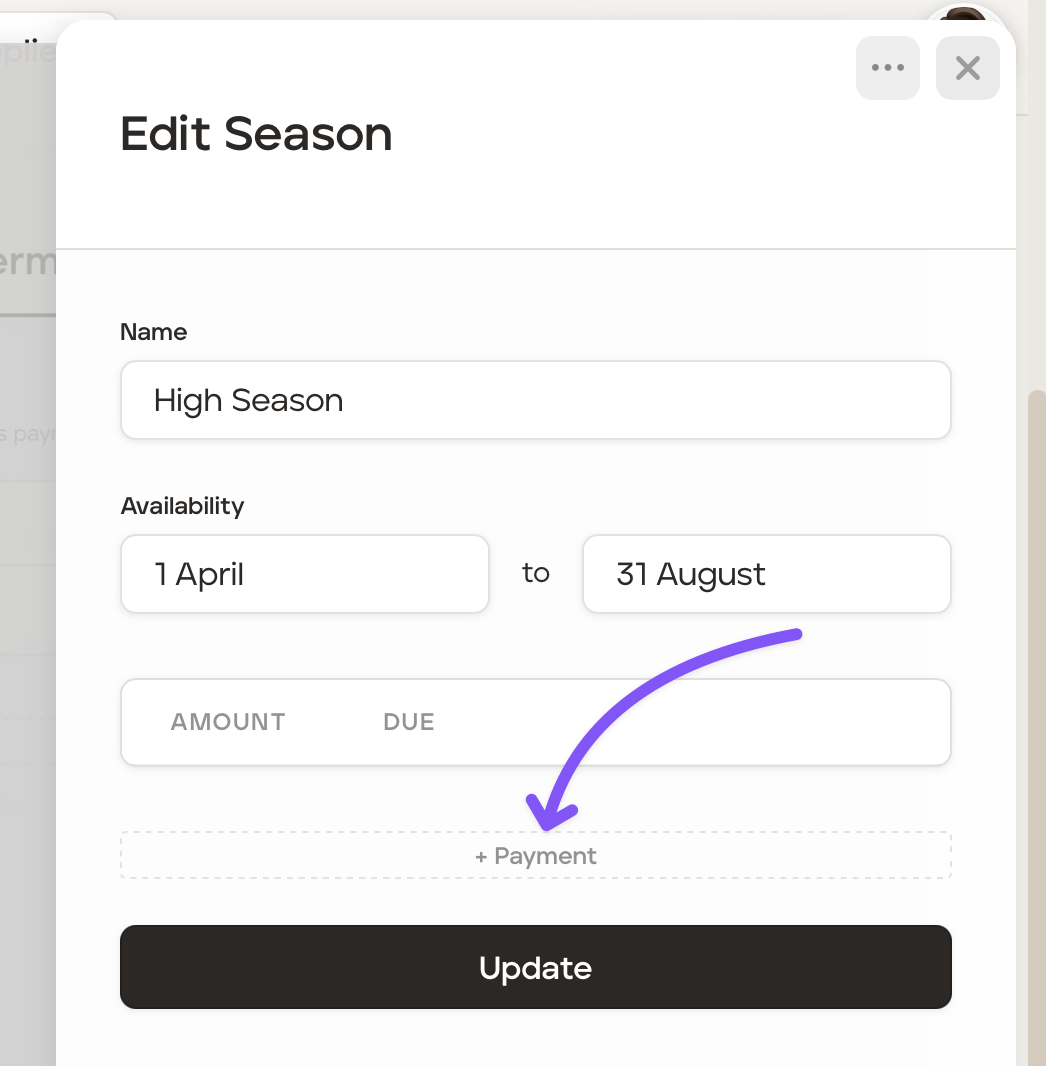 Add the name in the 'Name' field, for example: 'Year round' or 'High Season' and add the dates in the 'Availability' section to set when those payment terms will apply.