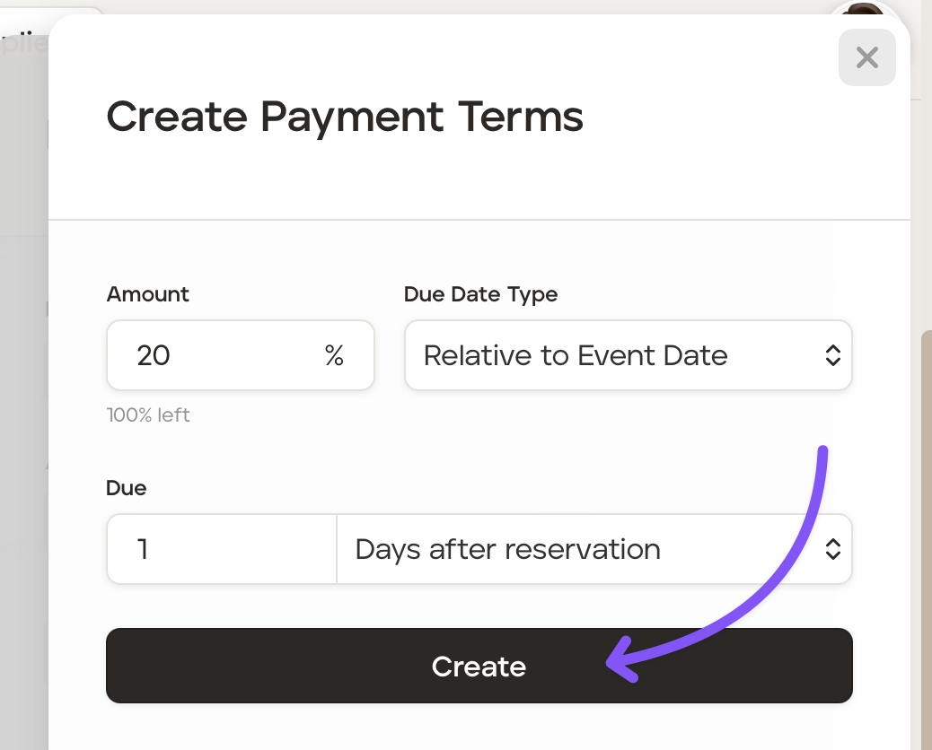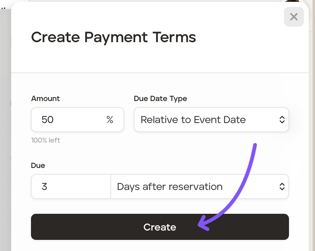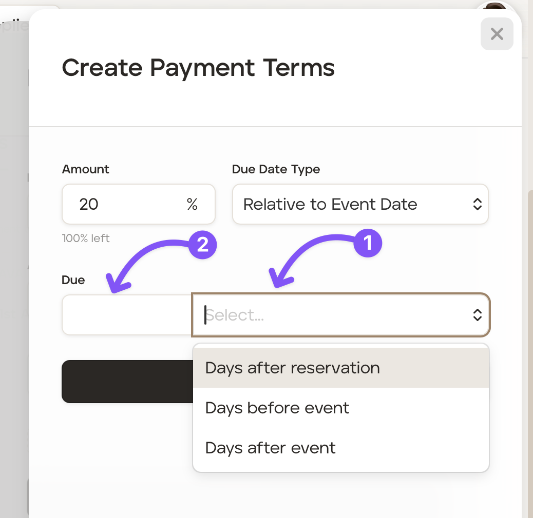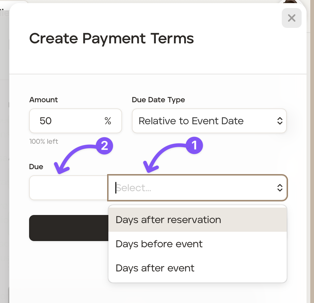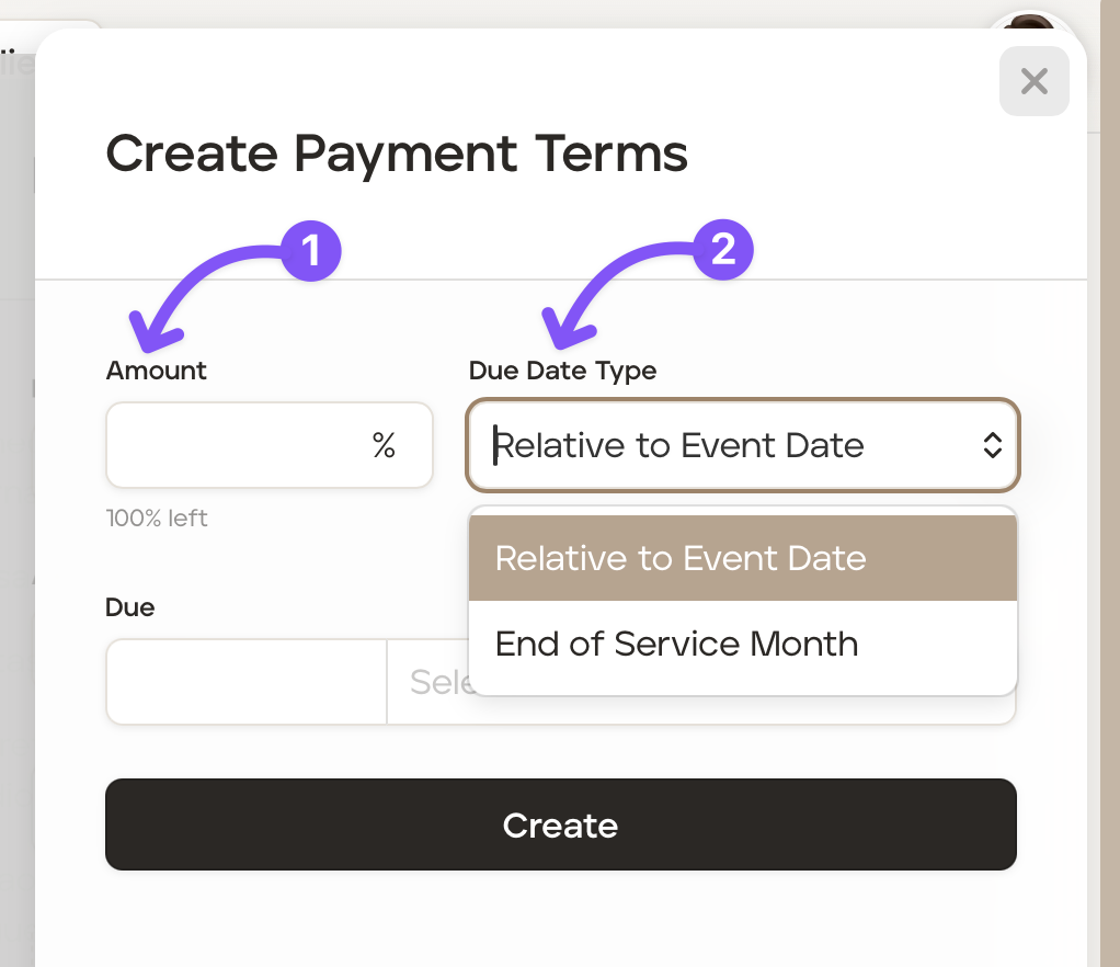Add the percentage of the total cost in the 'Amount' field followed by the due date is relative to the event date, or the end of the service month.