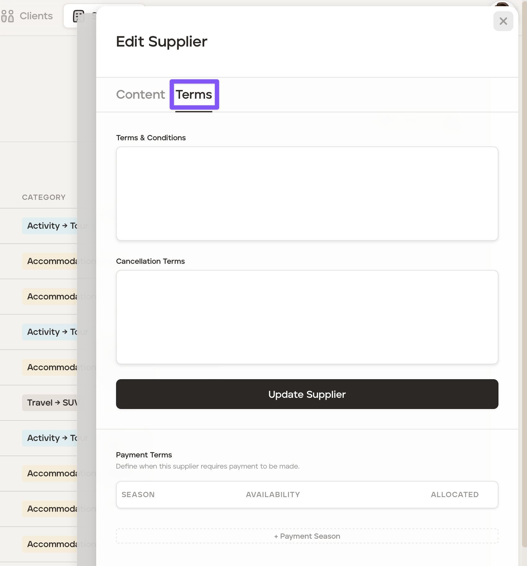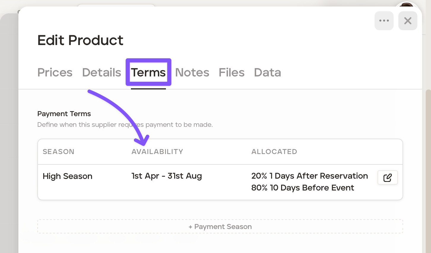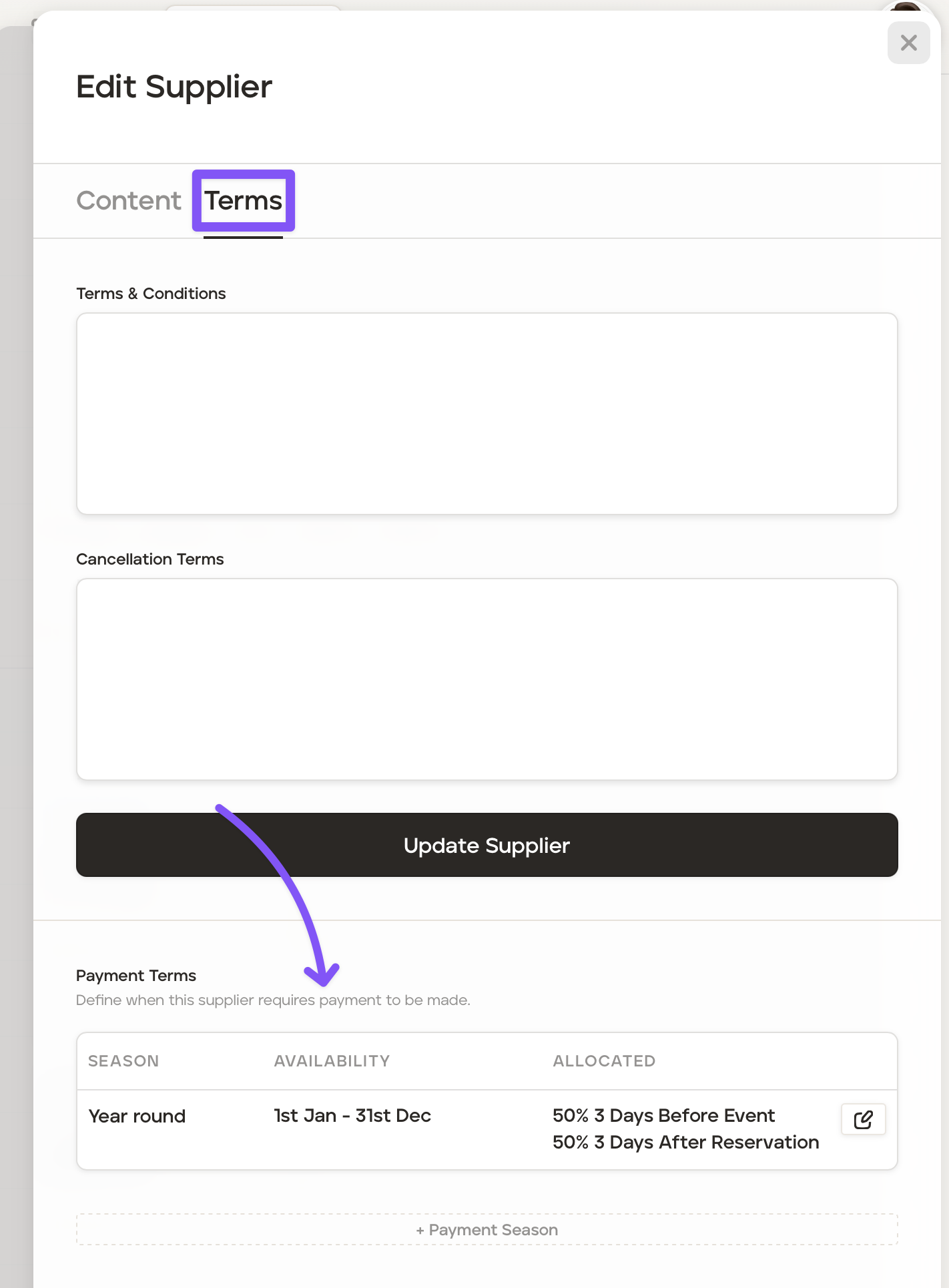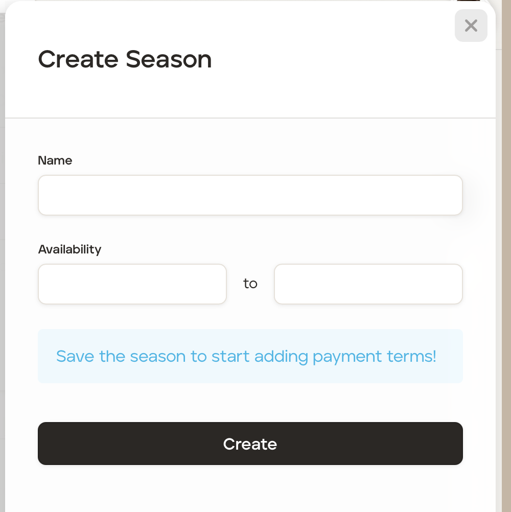 In the 'Payment Terms' section click '+Payment Season' to open the 'Create Season' section:
