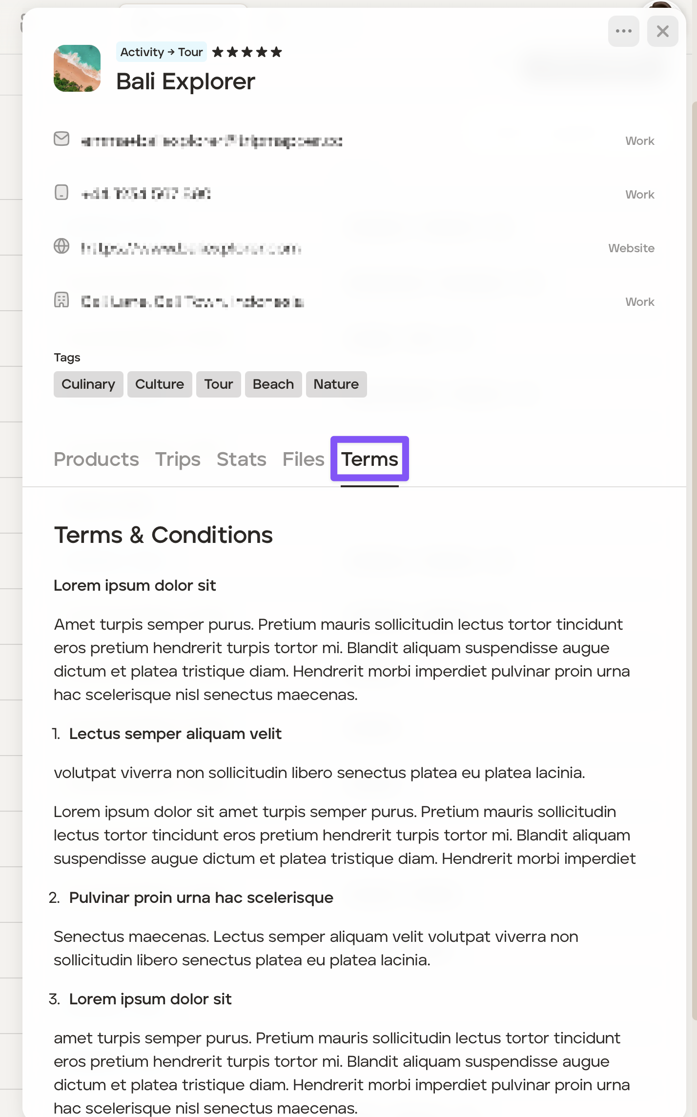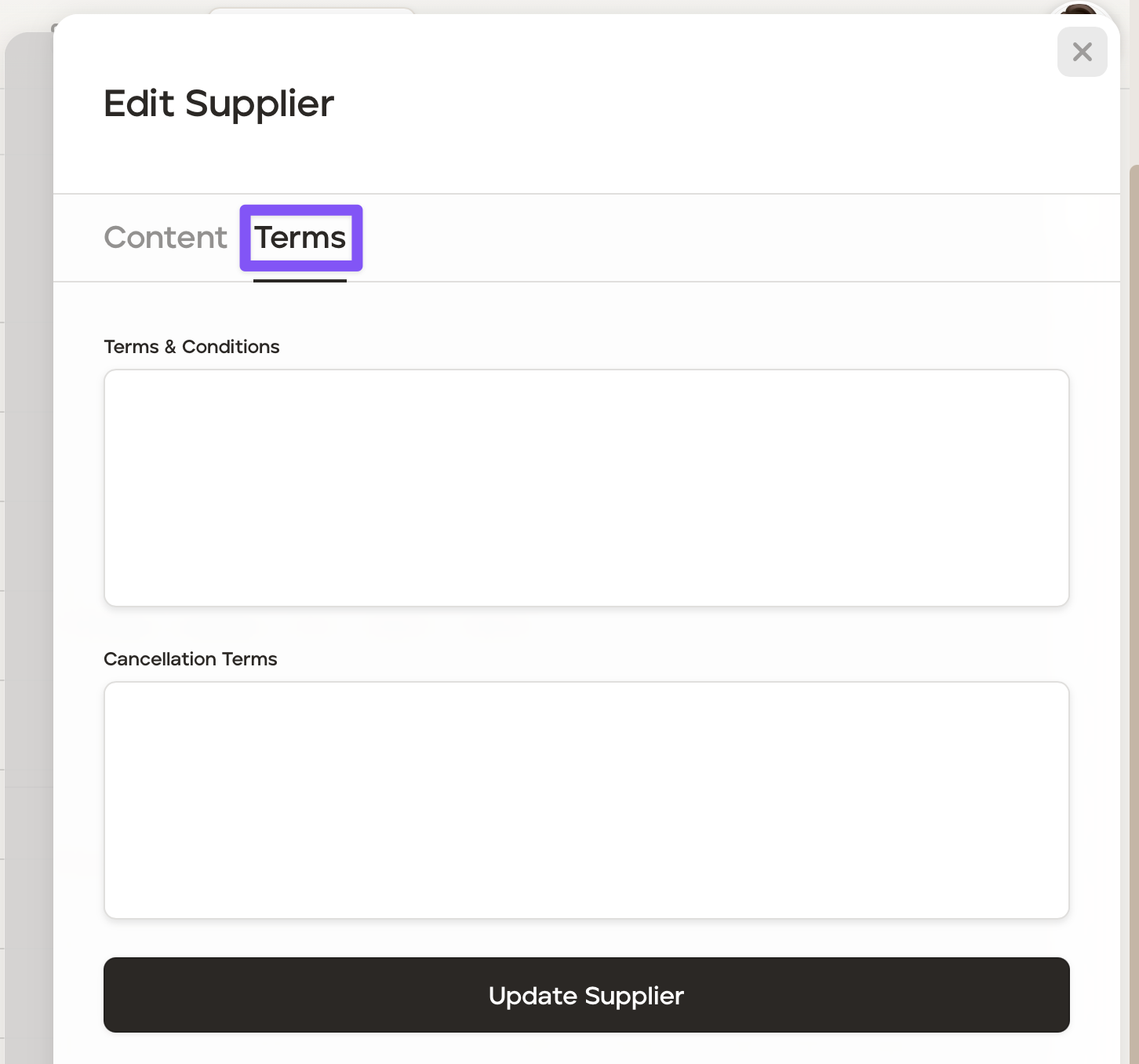 Add the terms in the 'Terms & Conditions' field and/or the 'Cancellation Terms' boxes.