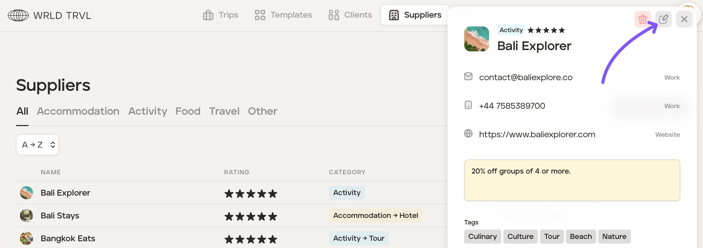 Click the edit icon located in the top right-hand corner of the modal to edit the supplier details.