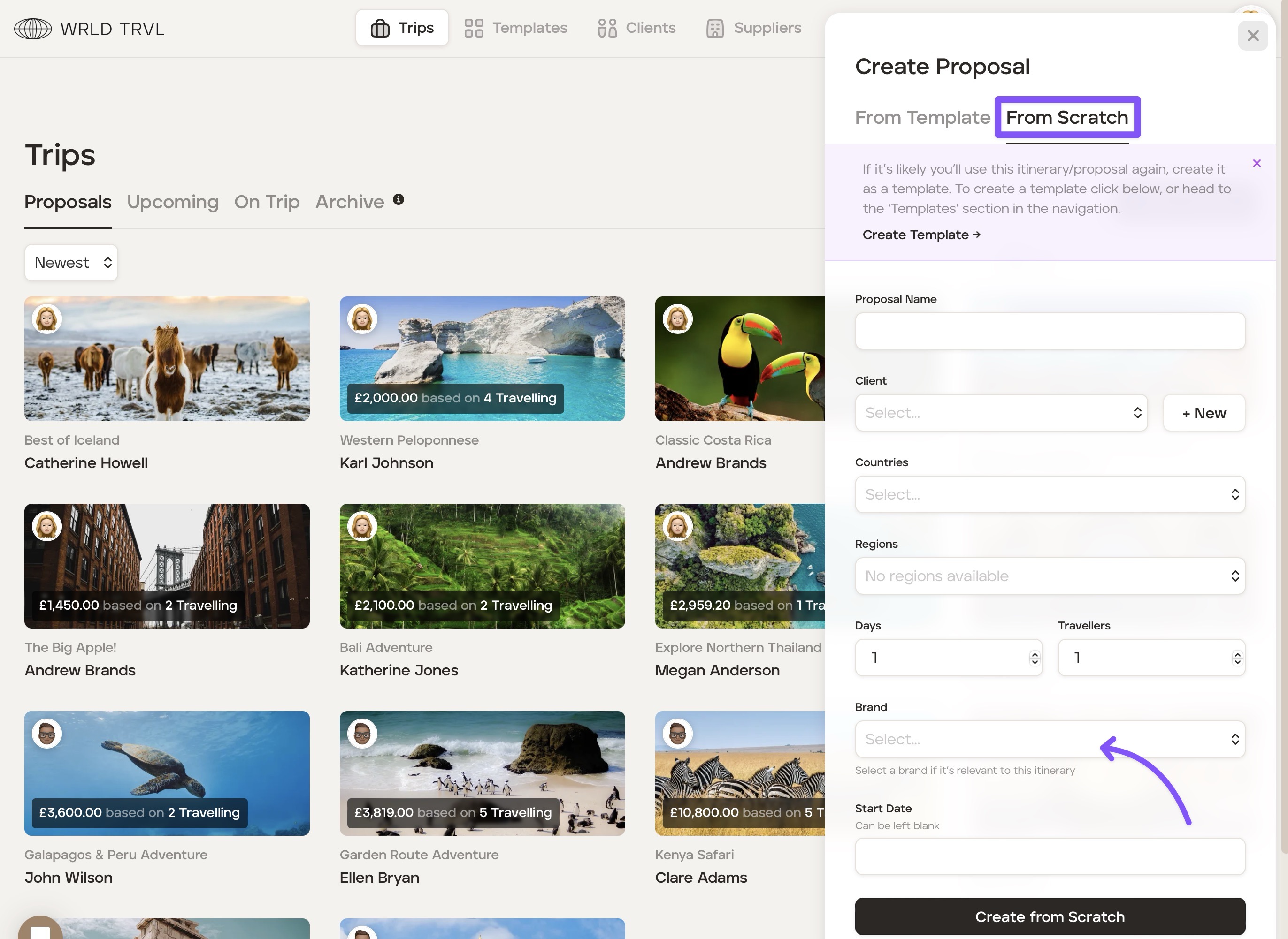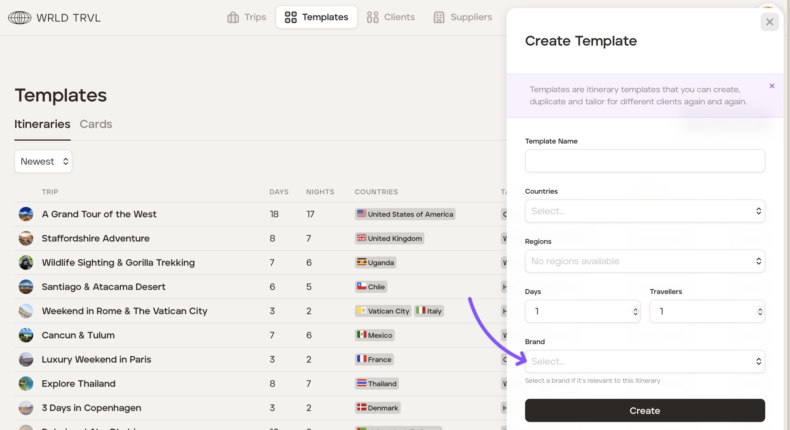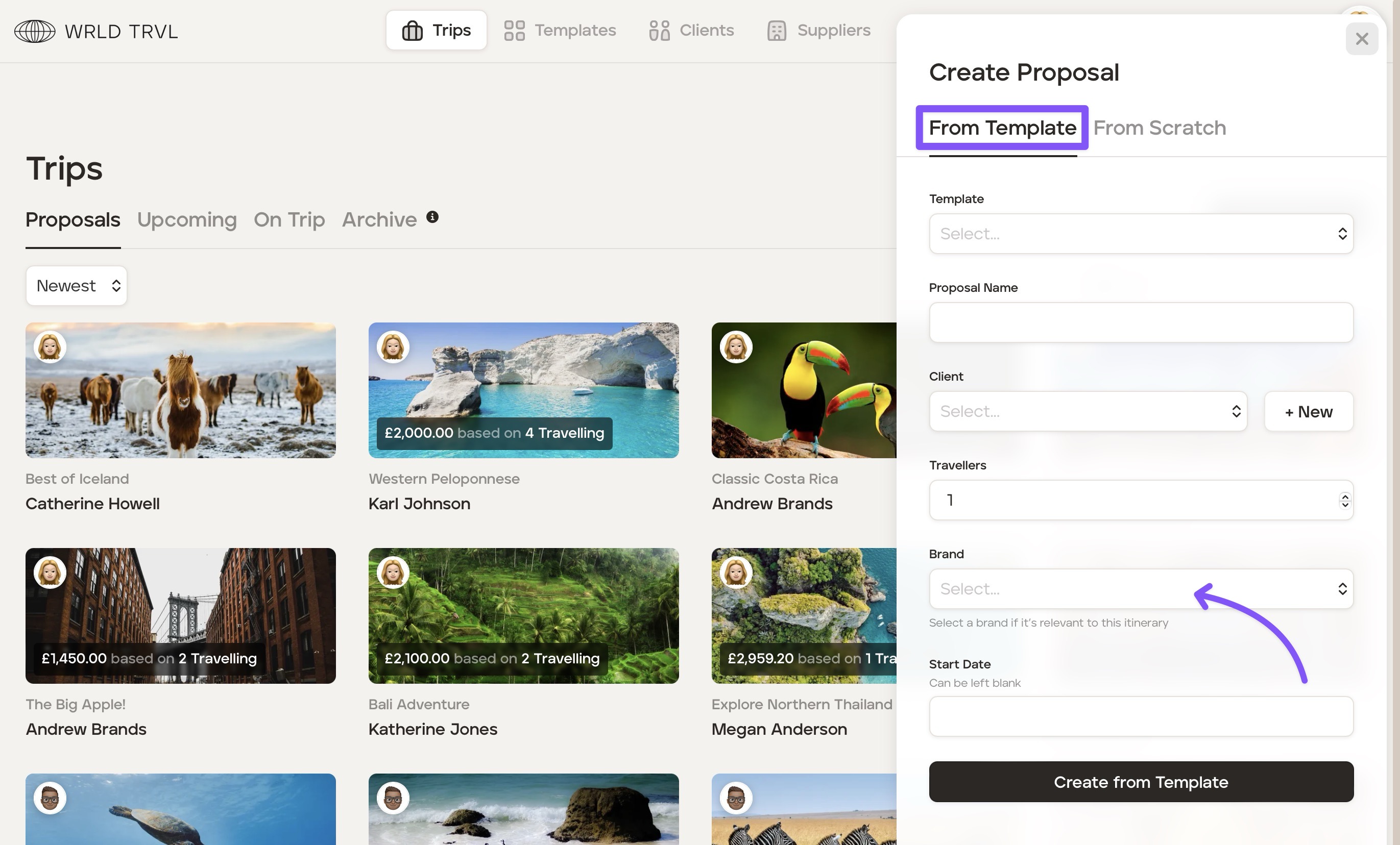 When this feature is enabled, you’ll be able to assign a business partner's brand to a template itinerary, trip itinerary and PDF itinerary. When the trip is accessed as a proposal, or an upcoming trip, the selected brand will show instead of your organisation’s branding.