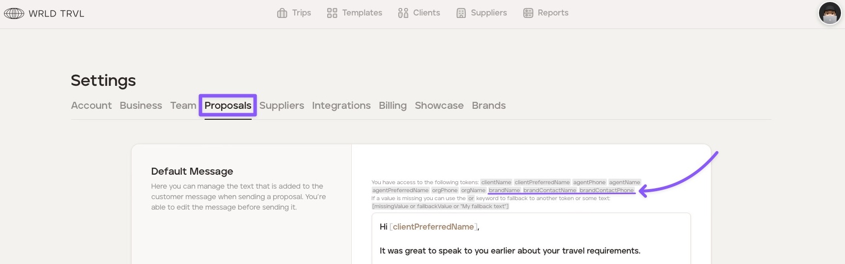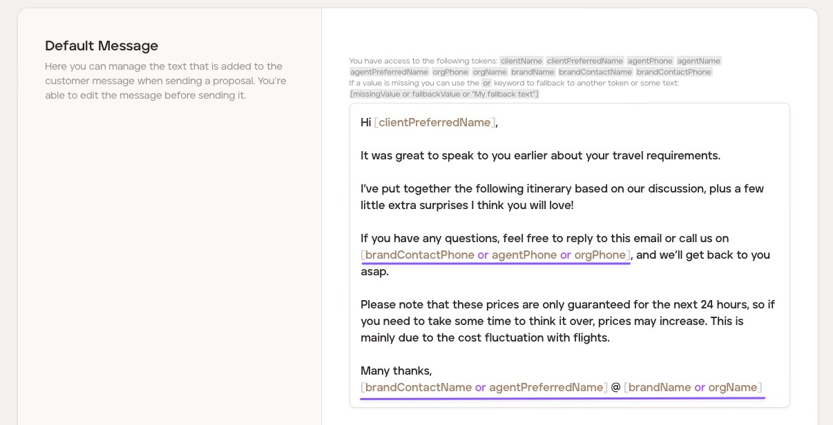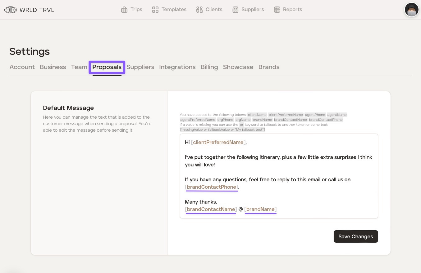 Click the 'Proposals' tab. In this section, you can manage the text that is added to your email when sending a travel proposal to your client (you’re still able to edit the text before sending it - this is just your default email).