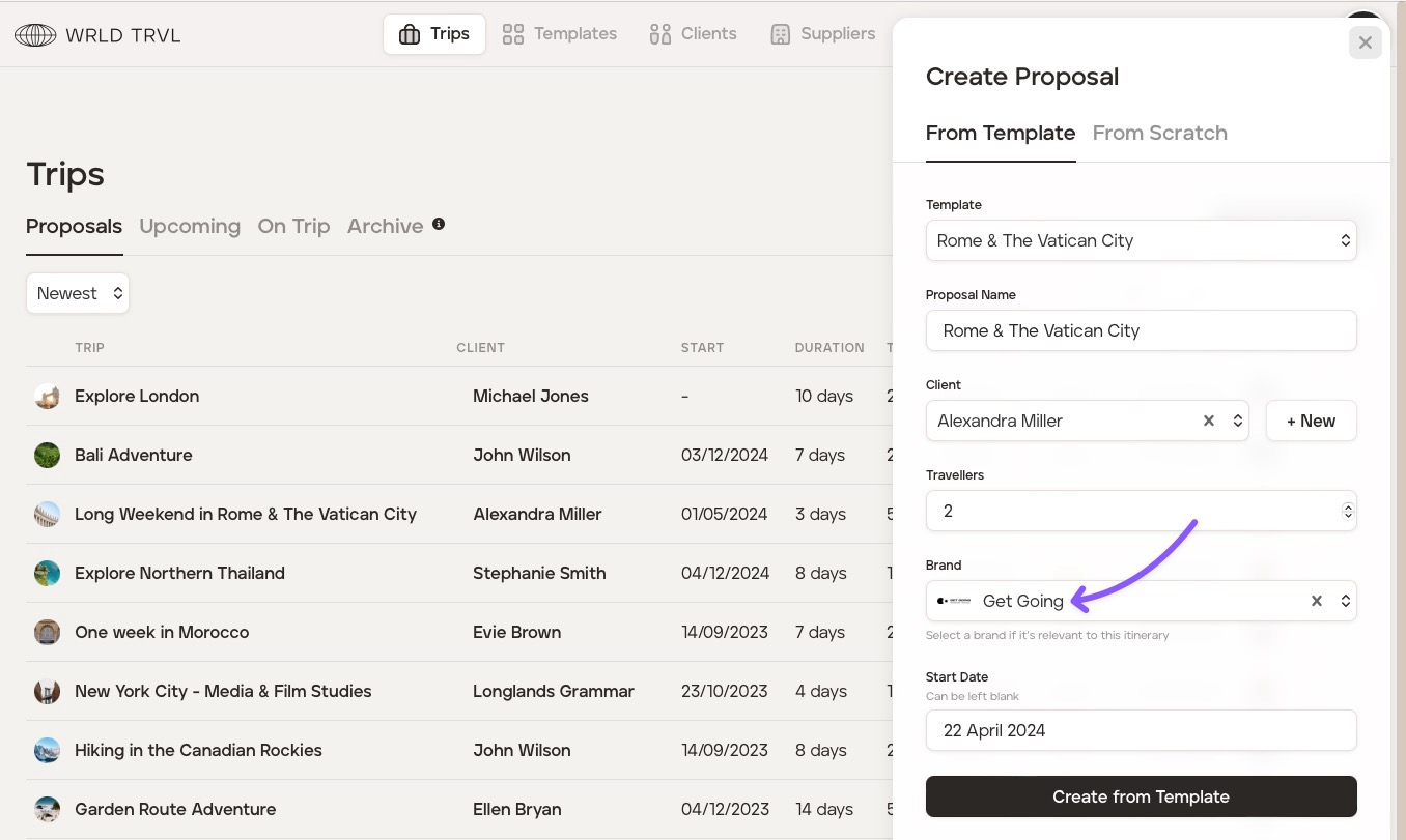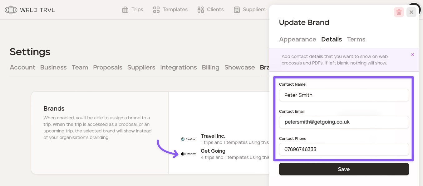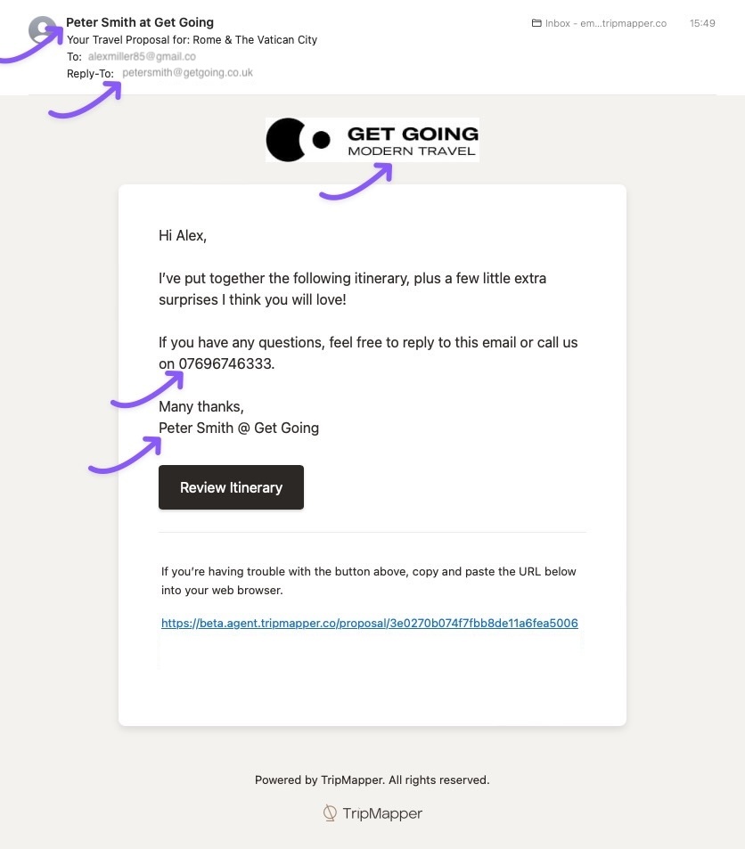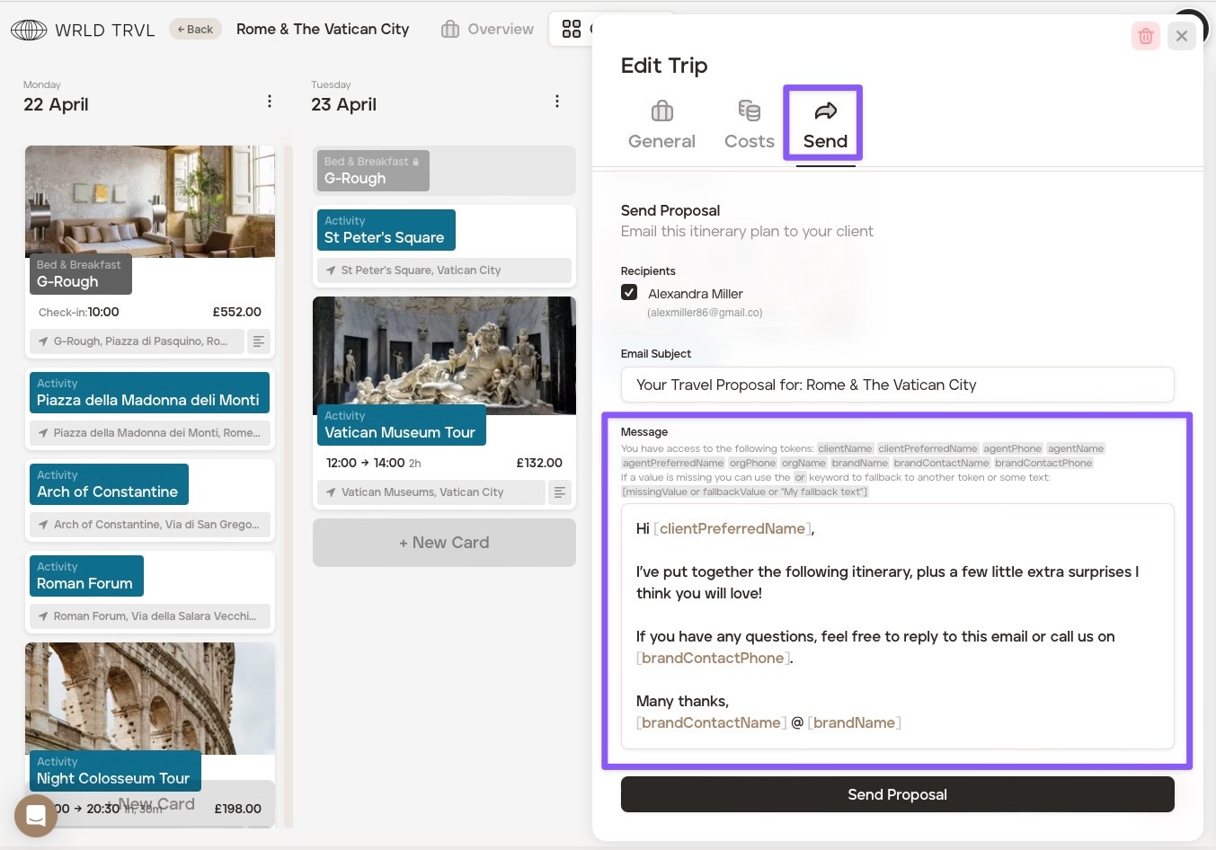 Click the 'Proposals' tab. In this section, you can manage the text that is added to your email when sending a travel proposal to your client (you’re still able to edit the text before sending it - this is just your default email).