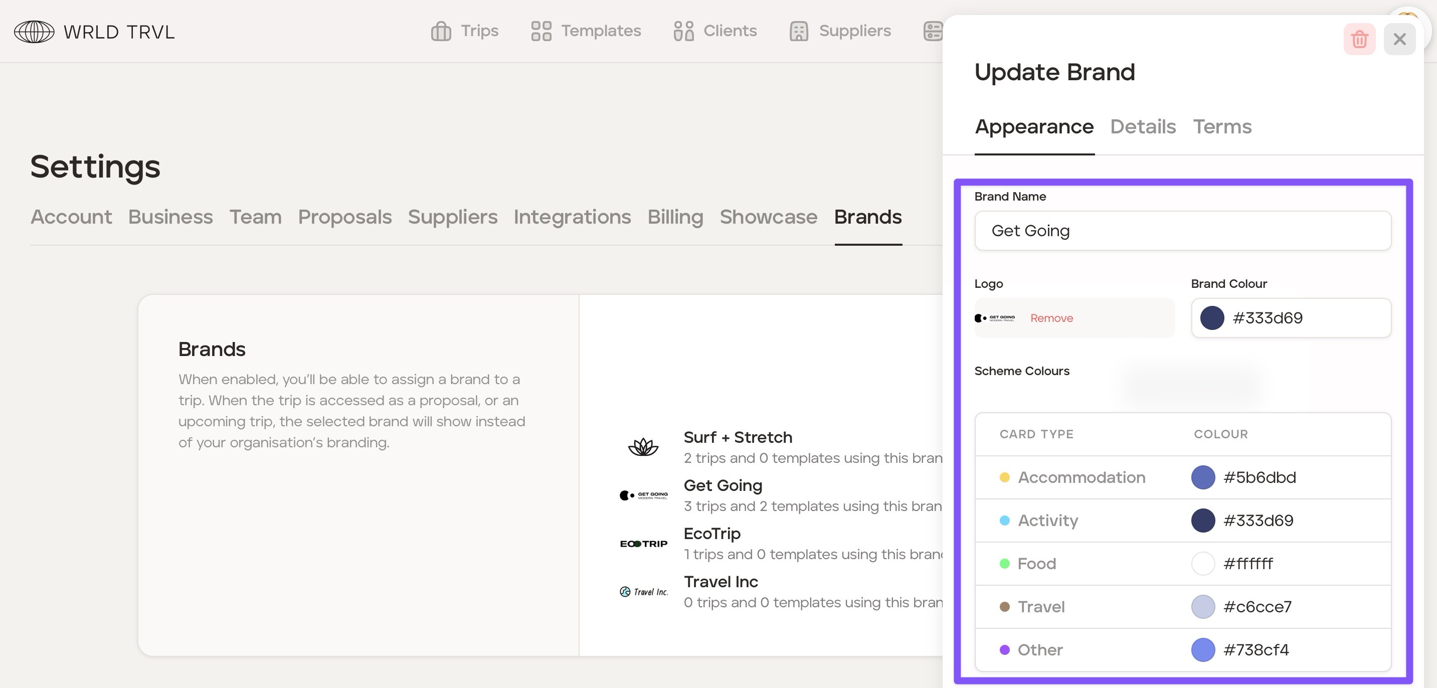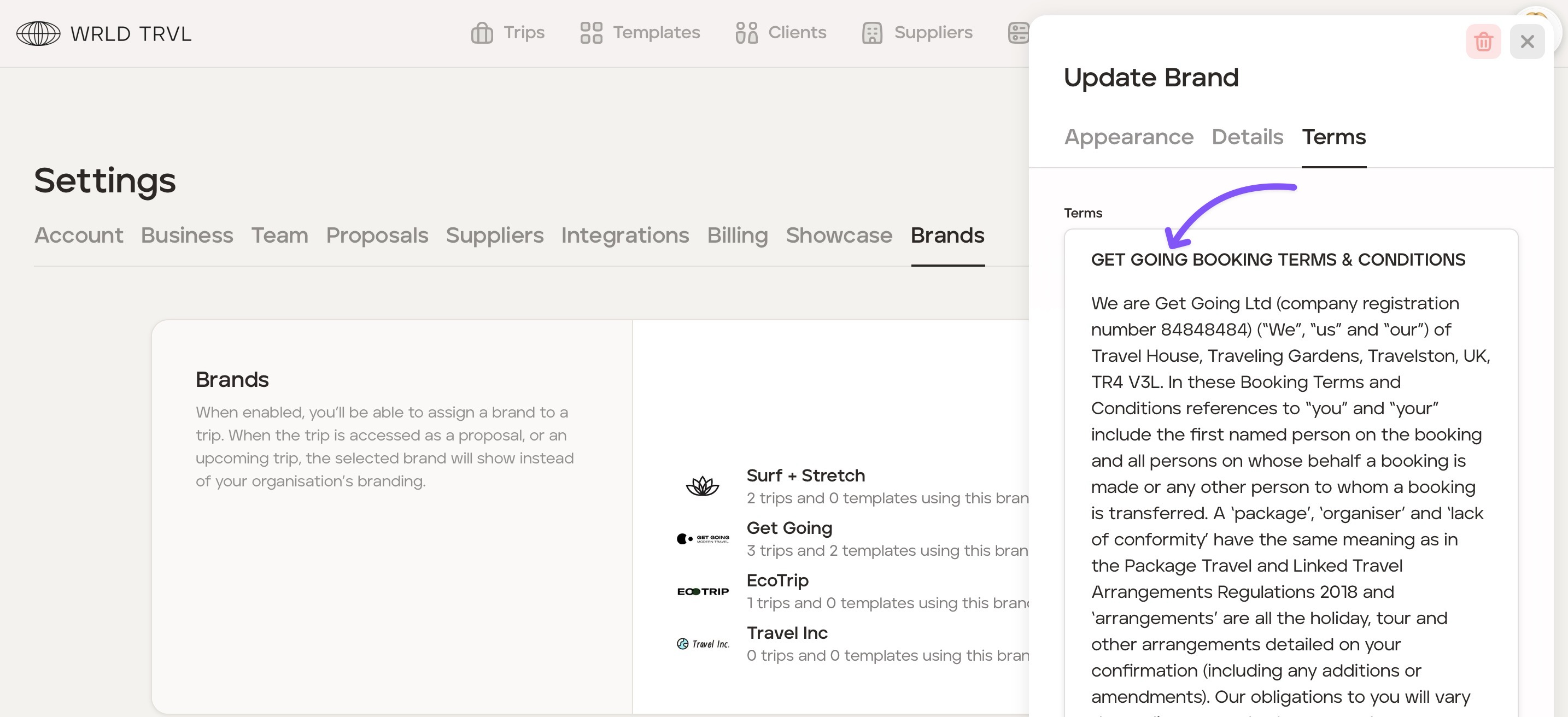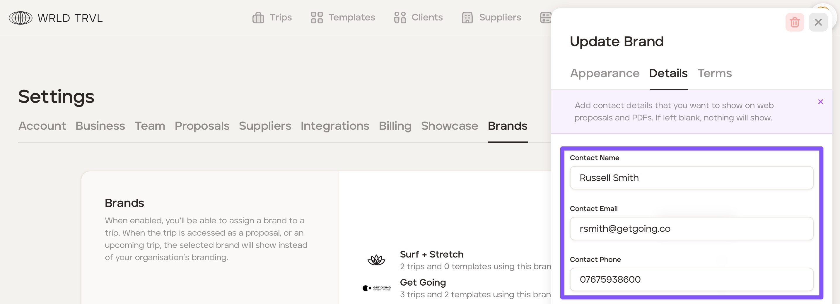 A business partner, 'Get Going', has been added to the 'Brands' section. The 'Get Going' agent is Russell Smith.