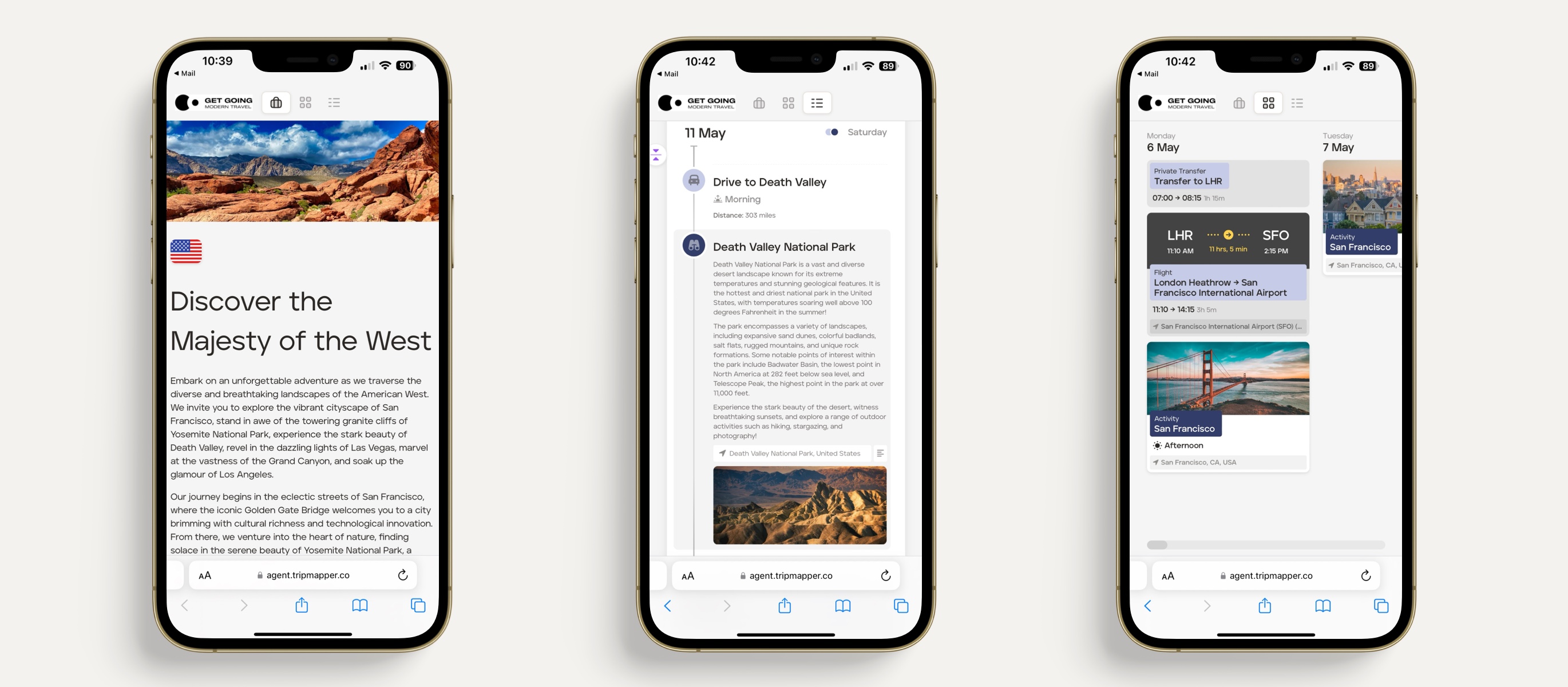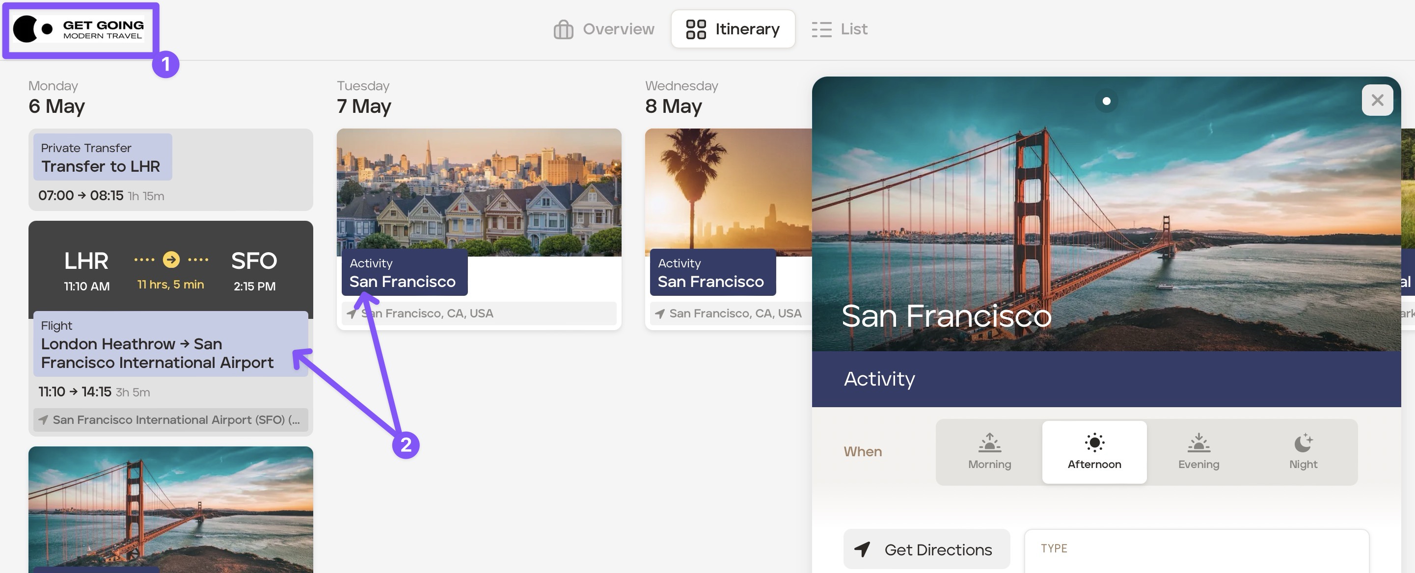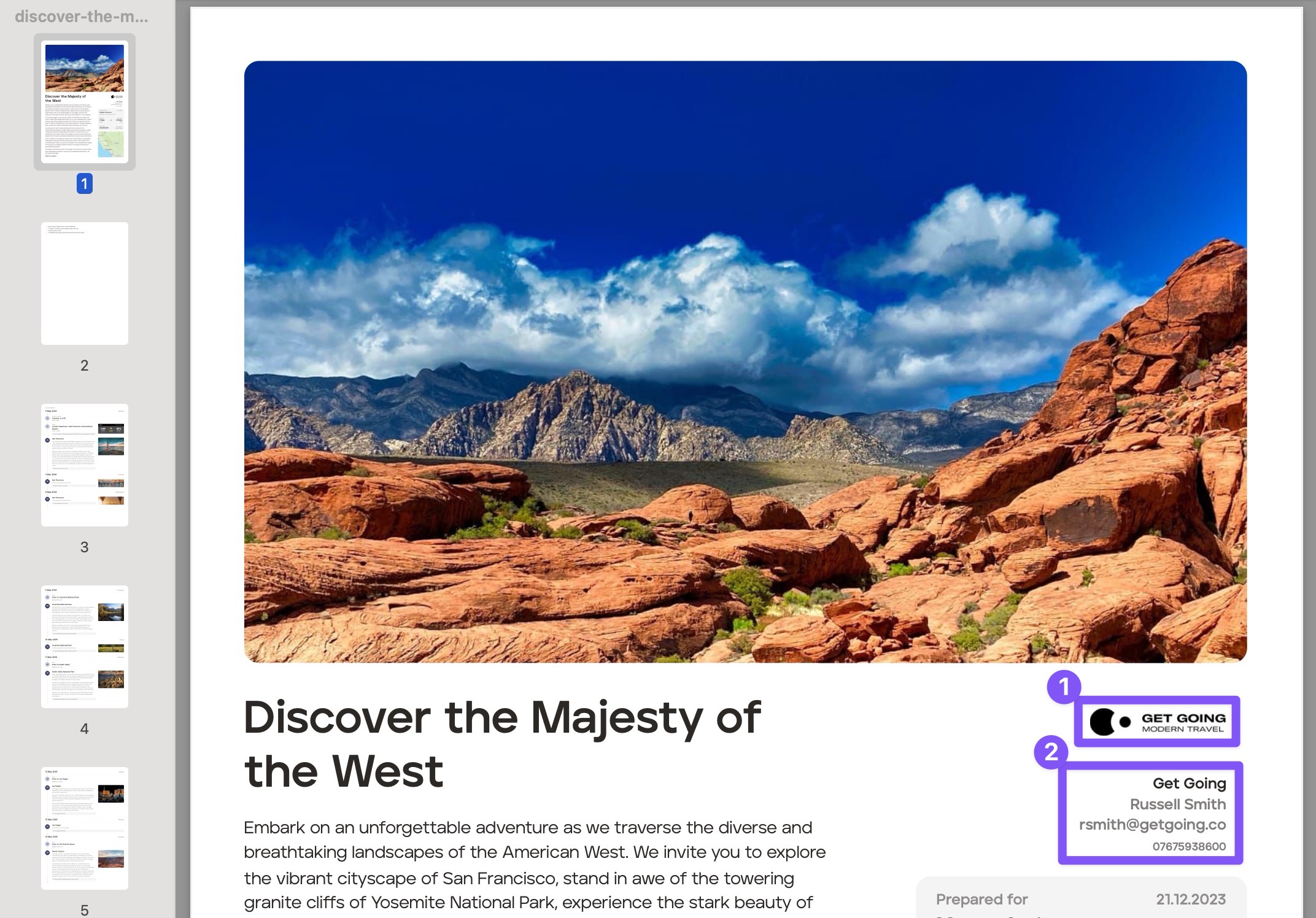 Example of a PDF itinerary containing 'Get Going' branding and agent contact details: