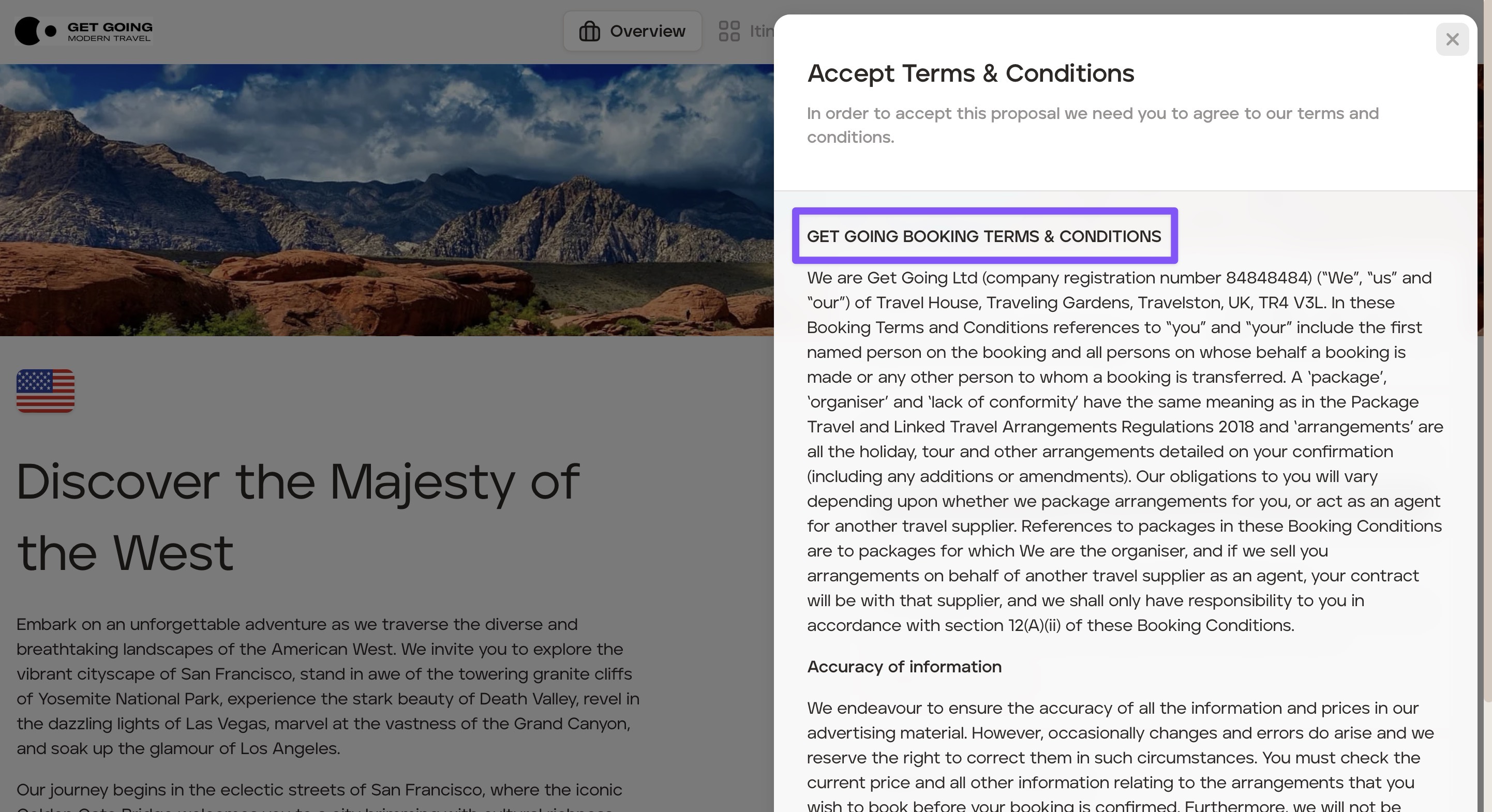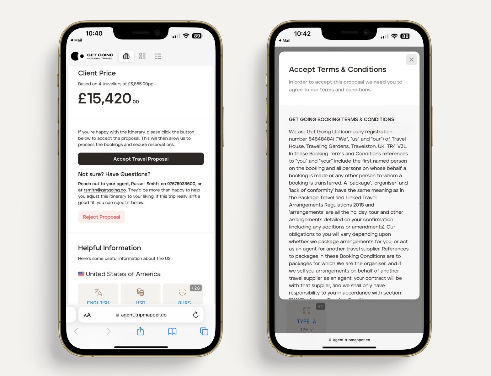 Example of a client web proposal containing 'Get Going' branding, agent contact details and terms