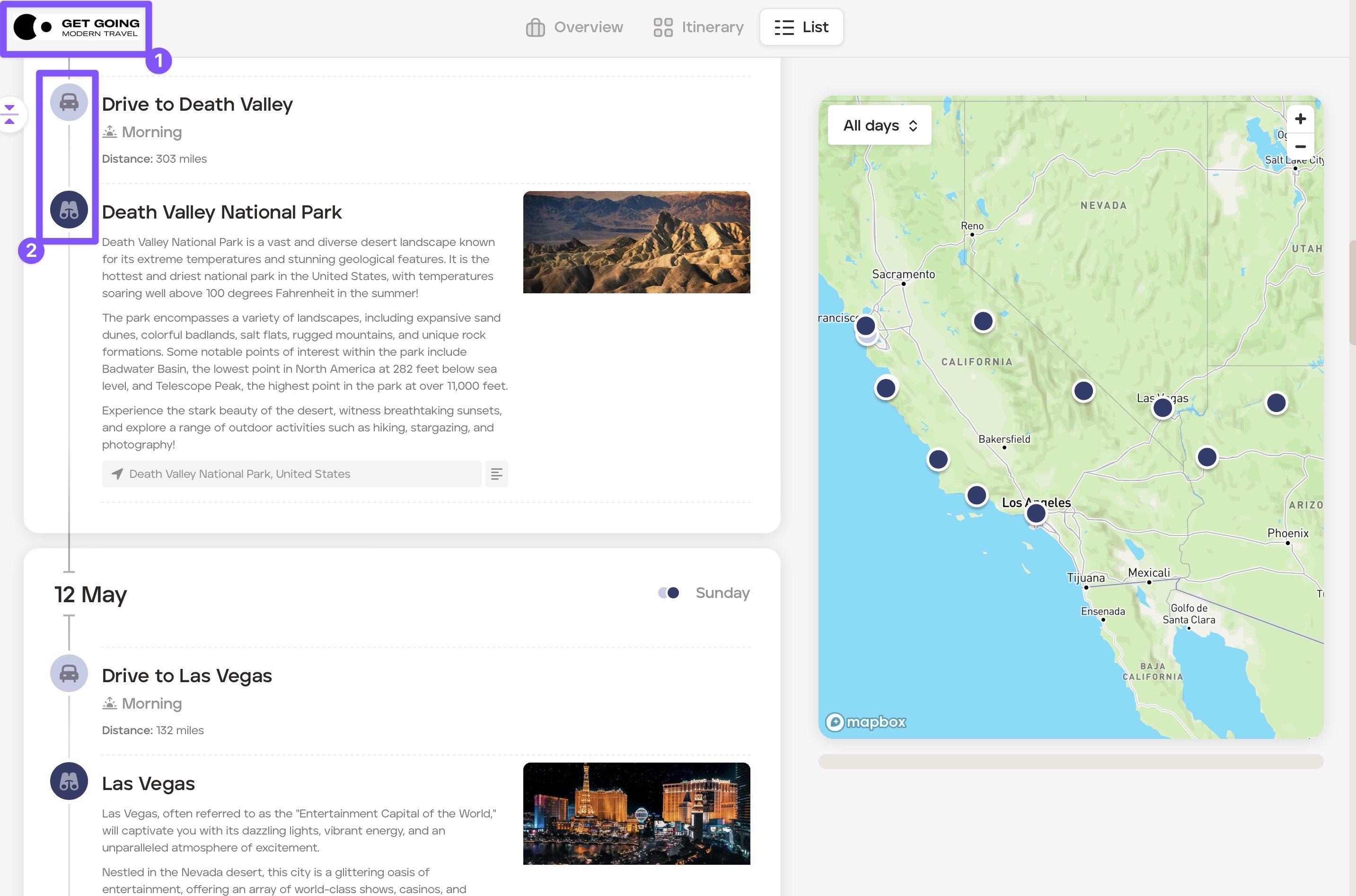 List view containing the 'Get Going' logo and card category colours and map pins to align with the brand colours: