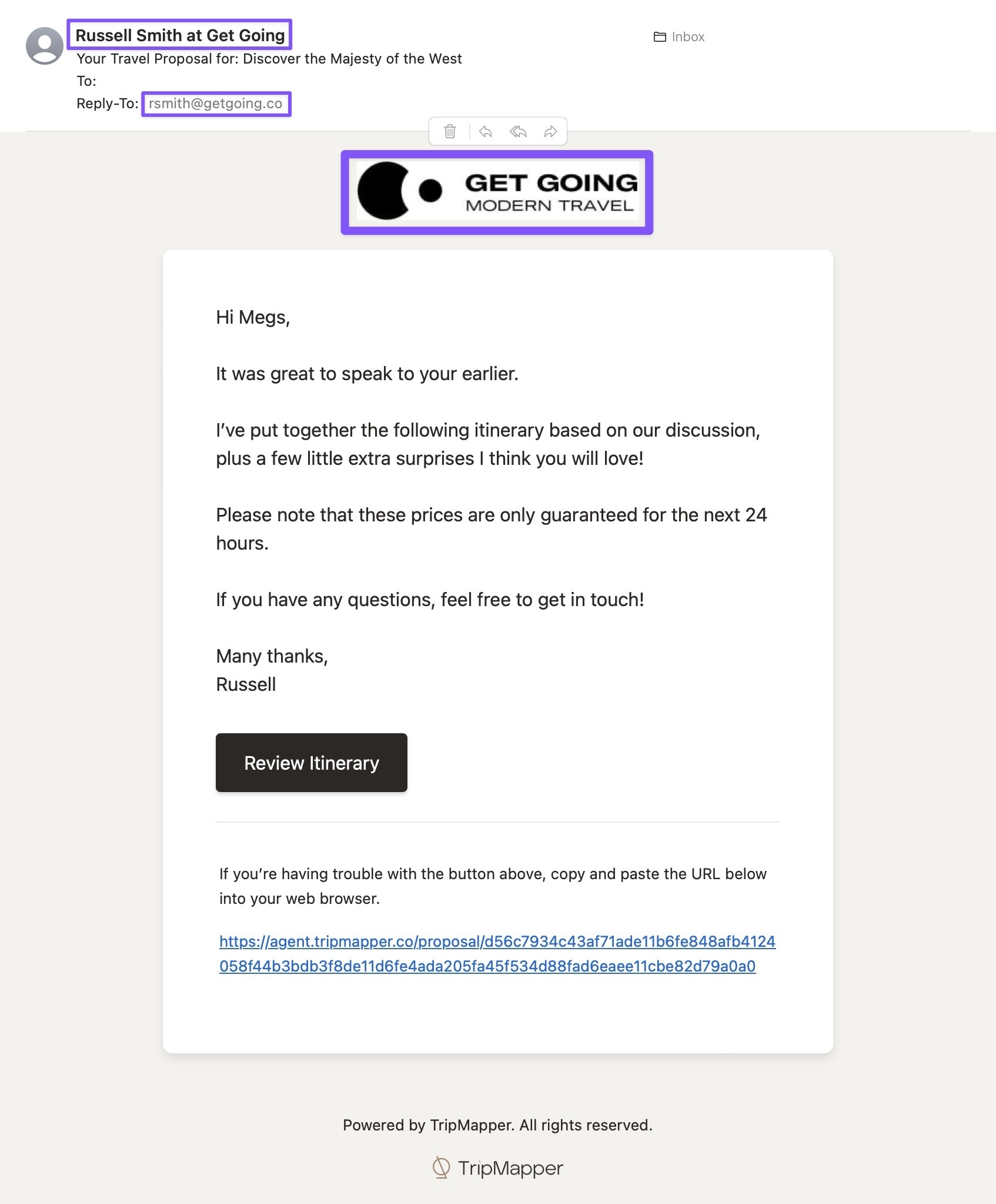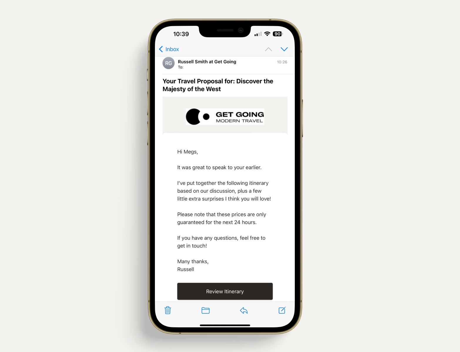 Example of the proposal email sent to the client via the platform containing 'Get Going' branding: